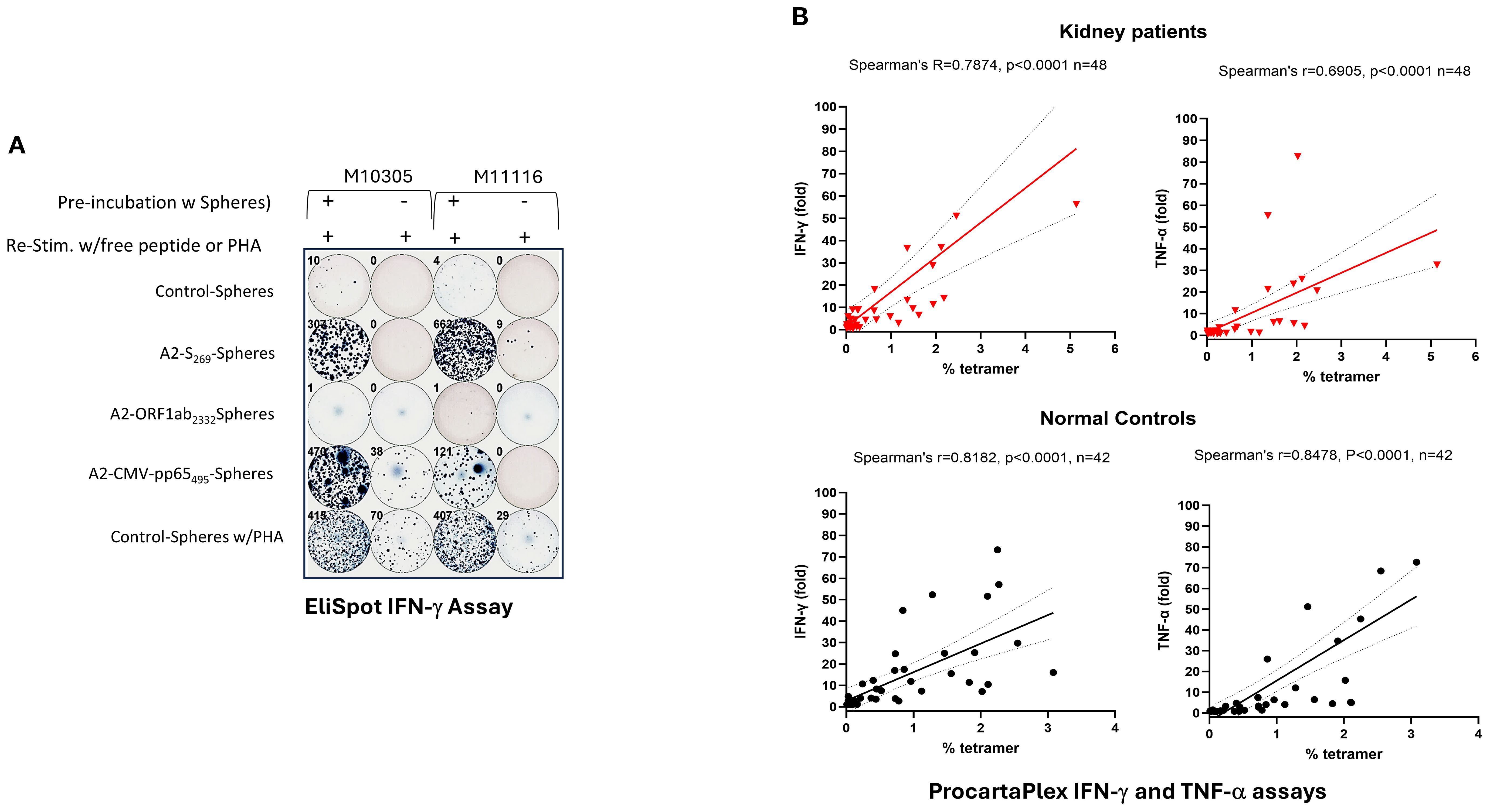 Figure 4. Induction of IFN-γ and TNF−α by PBMCs stimulated with A2/S269- peptide conjugated spheres in normal controls and kidney patients. (A) Increased IFN-γ producing cells in PBMCs by in vitro stimulation with various peptide conjugated spheres. In the ELISPOT assay, Cells cultured with A2-CMV-pp65495-spheres or with PHA (0.2x)were used as the positive controls, whereas cells cultured with control-spheres or without in vitro stimulation were used as the negative controls, respecitvely. Numbers of IFN-γ producing cells were visualized and automatically calculated by ImmunoSPOT2™ software. (B) ProcartaPlex assays of secreted IFN-γ and TNF-α in supernatants from cells stimulated with SARS-CoV-2S269-peptide conjugated spheres. Spearman’s rank correlation and simple linear regression were used to determine the relationship between the frequency of tetramer+ vs the fold of cytokine (IFN-γ and TNF-α) release by cognate peptide stimulation. .