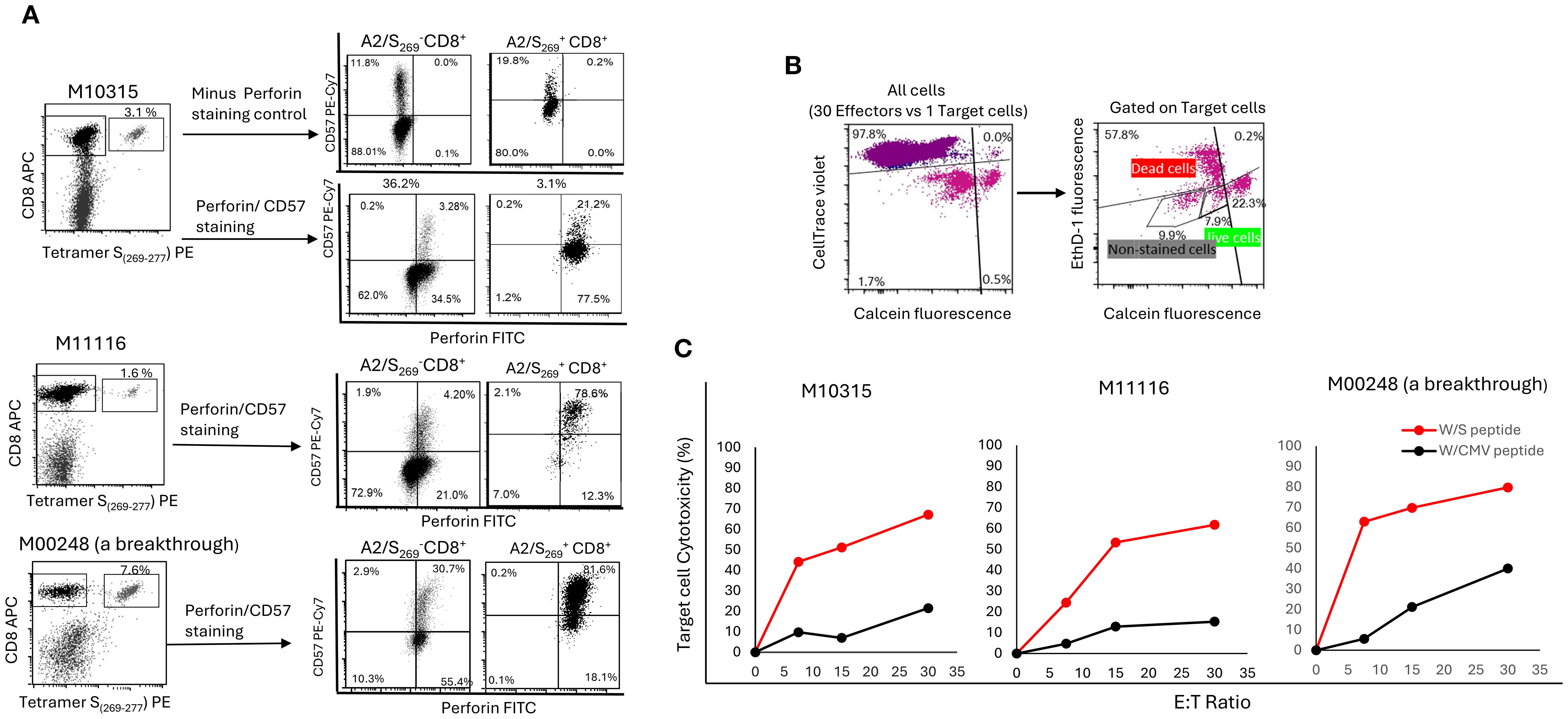 Figure 5. A2/S269+ CD8+T cells were enriched in CD57bright/Perforinhigh subset and were highly cytotoxic to HLA-A*02:01 target cells in an antigen specific- and a dose dependent- manner. (A) PBMC from 3 HR normal controls were in vitro stimulated as described. After tetramer staining, cells were counter-stained with CD57 and perforin mAbs. Minus-Perforin staining was also performed in M10315 to rule out some false positivity associated with intracellular staining of perforin. The histogram of this analysis is shown in Supplementary Figure S2. (B) Gating strategy for cell mediated cytotoxicity. Effectors which stained with CellTace Violet were first to be gated out, followed by gating out unstained target cells. Calcein AM (green) positive target cells were counted as live cells, whereas double positive [Ethidium (red) and Calcein AM (green)] and Ethidium positive (red) target cells were all counted as dead cells. (C) Target specific and dose dependent of A2/S269+CD8+ T cell mediated cytotoxicity. The percentage of effector cell mediated cytotoxicity was calculated using the following equation: Cytotoxicity (%) = 100*(total deaths target cells-spontaneous deaths) / (100-spontaneous deaths).