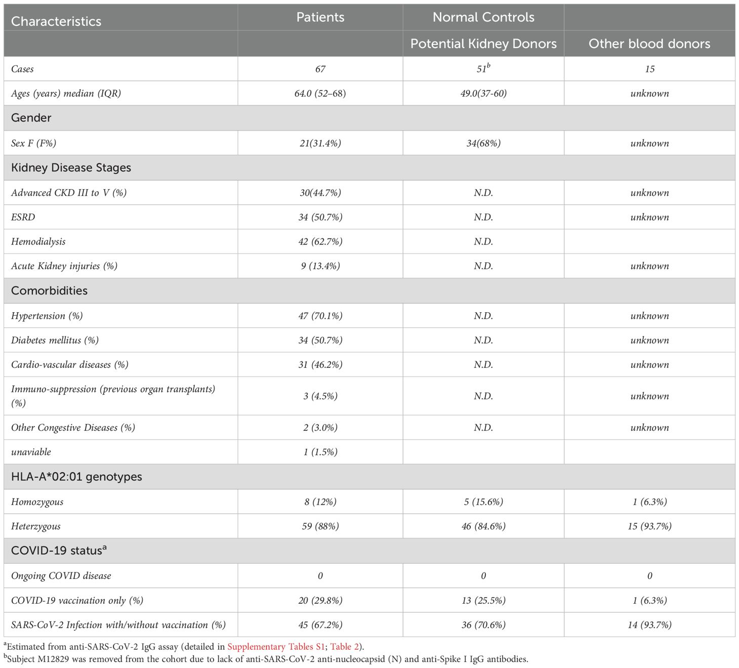 For this study, we recruited a total of 133 subjects. Eligible participants were categorized into two cohorts: the kidney patient group (transplant candidates) (n=67) and the normal control group (n=66), consisting of 51 prospective kidney donors and 15 additional blood donors. Kidney patients in our cohort were significantly older (median age 64.0, IQR: 52-68) and predominantly male, while prospective kidney donors were younger (median age 49.0, IQR: 37-60) and predominantly female. Most patients (>95%) were either in advanced stages (III to V) of chronic kidney disease (CKD) or already with End-Stage Renal Disease (ESRD) requiring hemodialysis (62.7%) and kidney transplants. All patients carried a wide range of comorbidities, including hypertension (70.1%), diabetes (50.7%), cardio-vascular disease (46.2%) and others. The summary of subjects’ characteristics in these two cohorts is shown in Table 1. The details of patients and normal control cohort, with respect to demographic characteristics, disease associations and profiles of anti-SARS-CoV-2 IgG antibodies are shown in Table 2 and Supplementary Table S2, respectively. Subjects were genotyped for HLA during clinical evaluation at Columbia University Irving Medical Center (CUIMC) between September 2022 and January 2024 and confirmed to be either homozygous or heterozygous for the HLA-A*02:01 allele.
