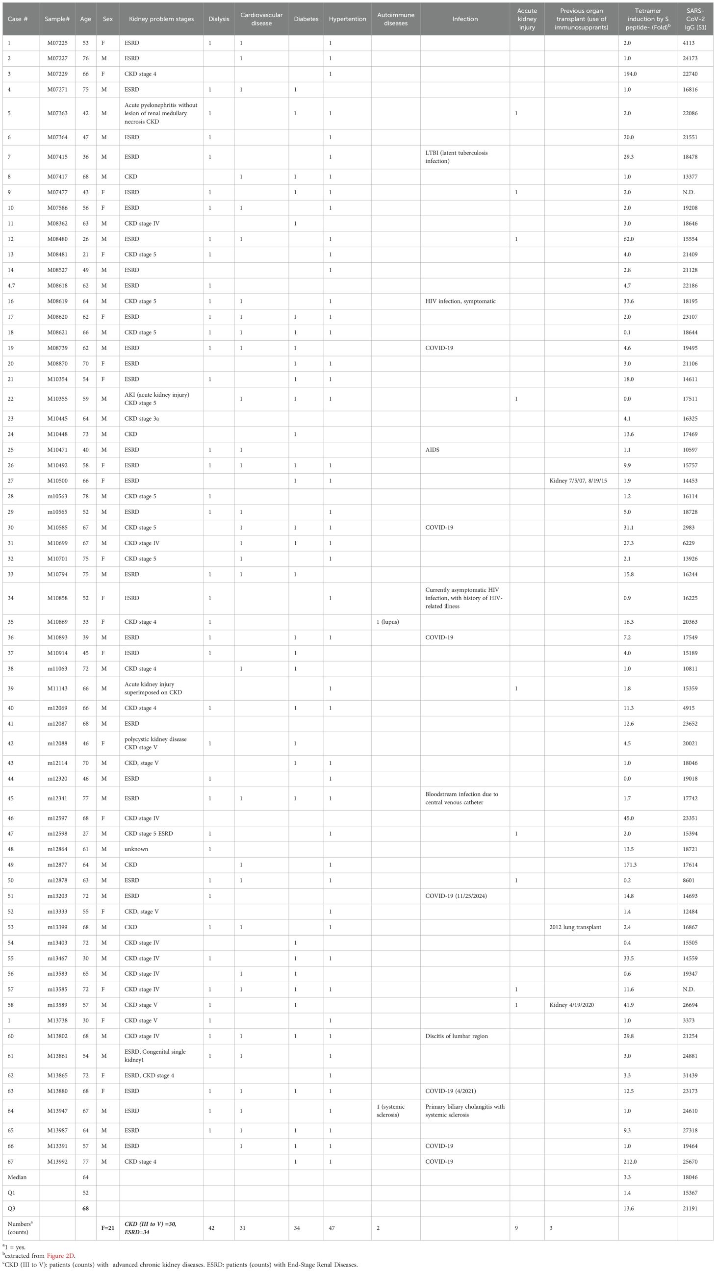 Due to the heterogeneity of the patient cohort with respect to underlying cause of kidney failure, we investigated whether the induction (fold) of A2/S269 tetramer+ cells was related to various kidney diseases. The induction of antigen-specific T cells was found to be randomly distributed among kidney patients ((Table 2). To clarify the roles of these disorders, we categorized kidney patients into two groups: ESRD, comorbidities due to non-immunological causes(hypertension, diabetes, cardio/vascular and acute injury) and ESRD caused by immunological conditions and(including autoimmune diseases and use of immunosuppressants for previous transplant. (Supplementary Figure S1 demonstrates that all two groups exhibited a similar median fold of induction (3.0) along with comparable interquartile ranges (IQR). A comparison analysis revealed that the differences were statistically insignificant (p=08157). The analyses indicated that comorbidities, immunosuppression, and autoimmune status did not influence the induction of tetramer-positive T cells or the responses specific to peptide antigens.