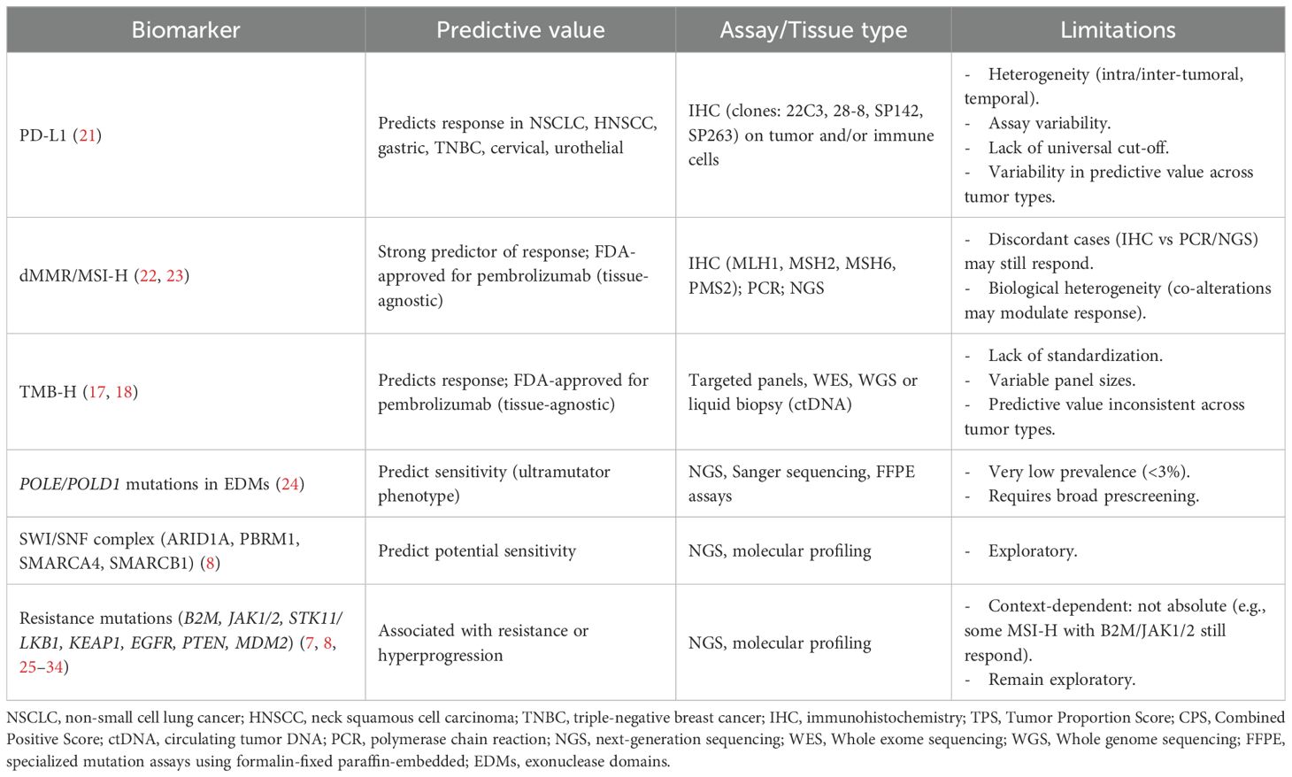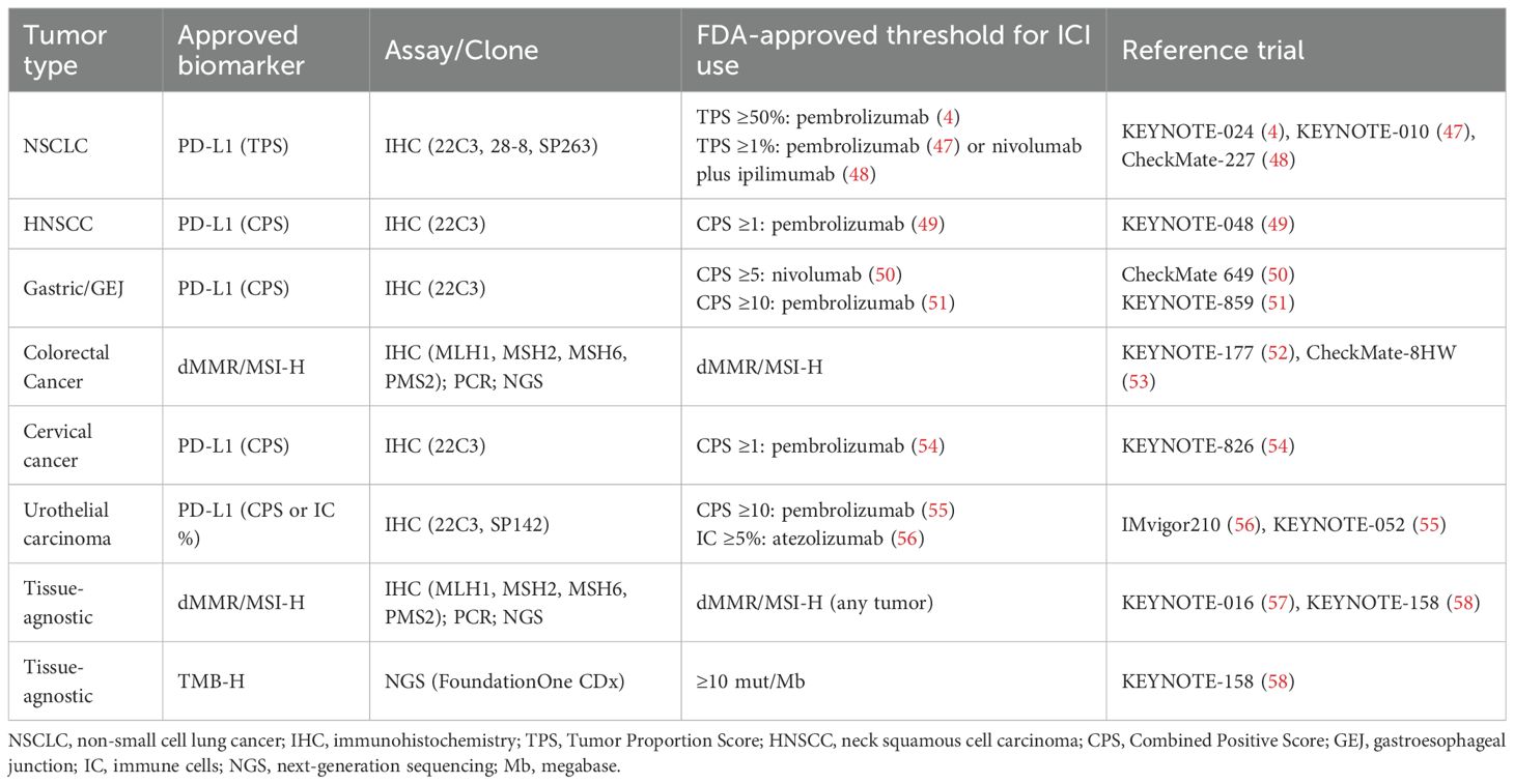In phase 1 clinical trials, the use of different thresholds to define PD-L1 positivity has yielded variable results, underscoring the lack of standardization in the application of this biomarker. The expansion cohort of the KEYNOTE-001 reported an ORR of 45%, 16.5% and 10.7% in patients with a TPS ≥50%, 1–49% and <1%, respectively (46). These findings led to FDA approval for PD-L1 expression and provided the basis for subsequent trials such as KEYNOTE-010 (cut-off ≥1%) and KEYNOTE-024 (cut-off ≥50%) in NSCLC (4, 47). Similarly, other anti-PD-(L)1 mAbs (e.g., atezolizumab or nivolumab) demonstrated responses predominantly in patients with high PD-L1 expression (Table 2) (48, 59). However, growing evidence suggests that PD-(L)1 blockade efficacy may be independent of PD-L1 expression in specific contexts, with clinical benefits observed in PD-L1 negative tumors (2, 60). For example, in advanced renal cell carcinoma (RCC) treated with nivolumab, the median overall survival (OS) was paradoxically longer in the PD-L1<1% population (27.4 months) compared to PD-L1≥1% group (21.8 months), challenging the pan-cancer predictive value (61). Overall, these limitations constrain its pan-cancer application. While PD-L1 remains an established biomarker in clinical decision-making for approved ICIs in specific, well-defined contexts, its profound biological dynamism and susceptibility to technical variability render it an insufficient enrichment tool in early-phase drug development (62). Assay-dependent misclassification and arbitrary thresholds may overestimate drug activity in biomarker-selected populations or inadvertently exclude PD-L1–negative patients who could benefit from treatment. Therefore, while PD-L1 retains clinical utility as an accessible and widely implemented biomarker, particularly for patient selection in specific indications, its limitations suggest that it may be more appropriately integrated as a stratification factor, an exploratory endpoint, or as part of a more comprehensive, multi-parametric biomarker approach.