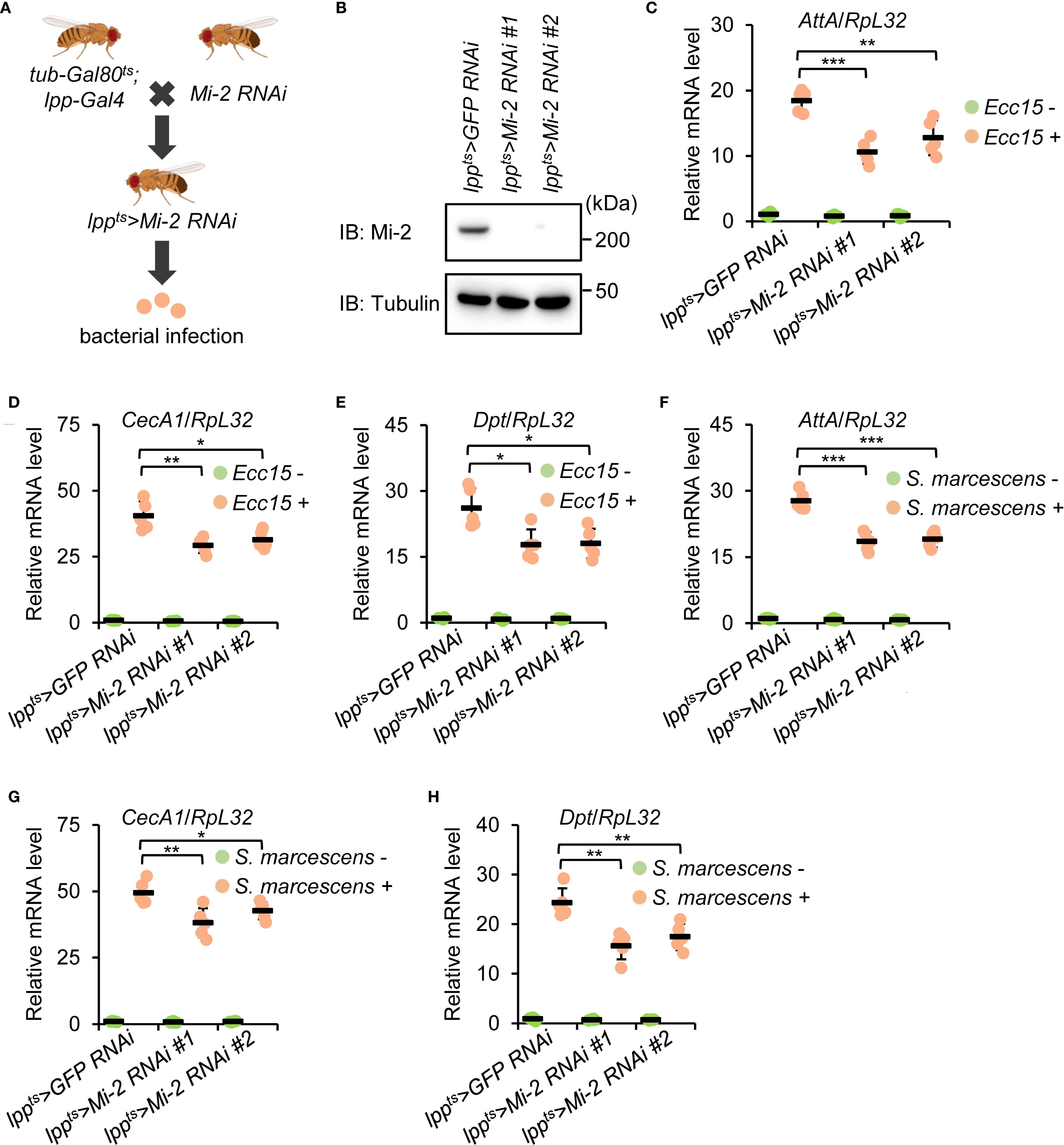 Figure 1. Drosophila Mi-2 is required for AMP induction following bacterial infection. (A) The diagram showing genetic manipulations to obtain flies with the fat body-specific silencing of Mi-2. (B) Western blot monitoring Mi-2 protein levels in the fat body dissected from control and Mi-2 RNAi flies. Tubulin was used as the loading control. (C-E) Adult flies, including lppts>GFP RNAi (control), lppts>Mi-2 RNAi #1, and lppts>Mi-2 RNAi #2, were infected with Ecc15, followed by RT-qPCR assays to examine the transcript levels of AttA (C), CecA1 (D), and Dpt (E). (F-H) Similar RT-qPCR experiments were performed as in C-E, except that S. marcescens were used for infection. In C-H, data were collected from 5 independent replicates and shown as means plus standard errors. *P < 0.05; **P < 0.01; ***P < 0.001.