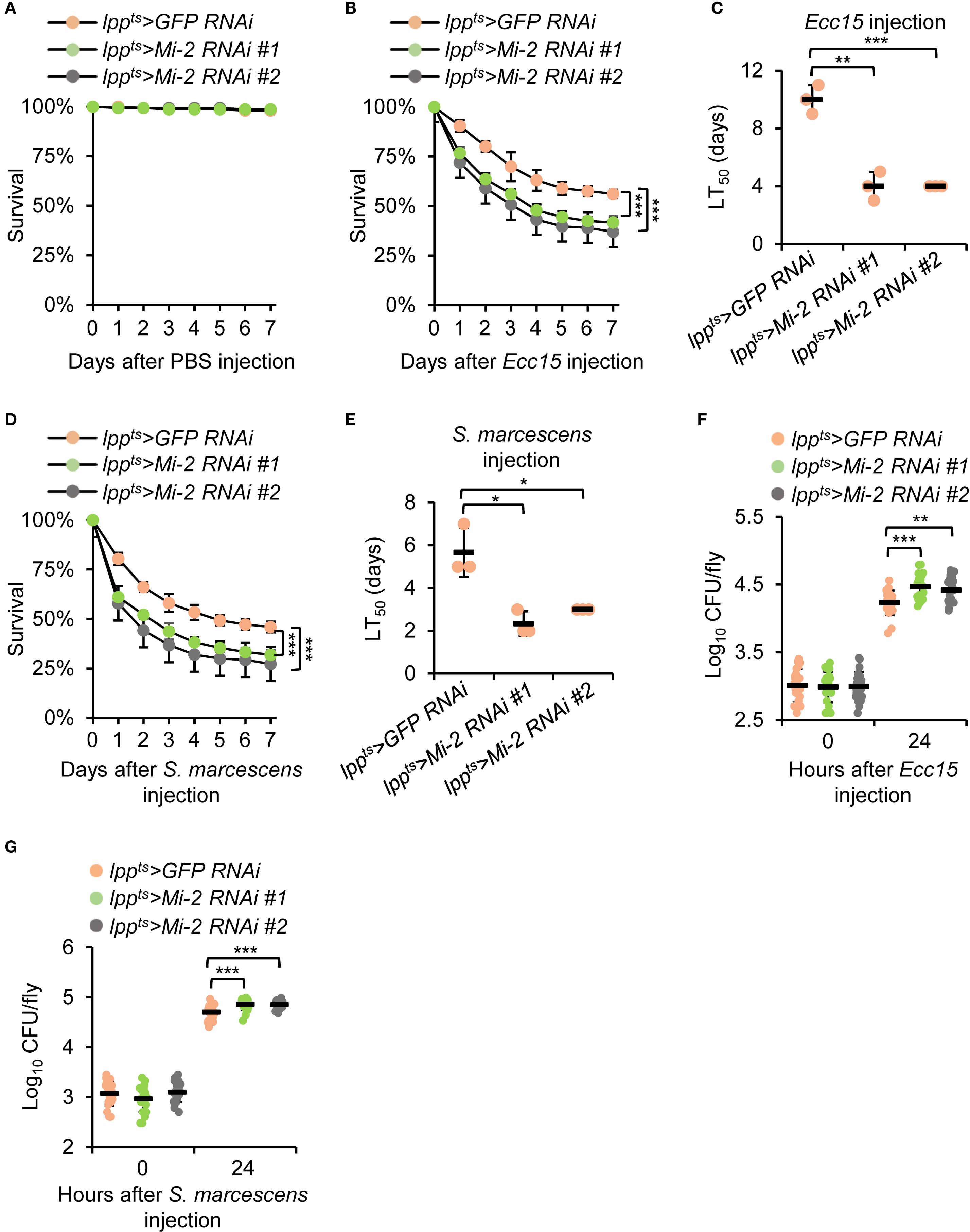 Figure 2. Mi-2 is essential for the Drosophila defense against bacterial challenge. (A-C) Survival curves of Mi-2 RNAi and control flies after the injection of PBS (A) or Ecc15 (B). The number of flies is as follows. In A, lppts>GFP RNAi: 50, 48, 50; lppts>Mi-2 RNAi #1: 49, 49, 50; lppts>Mi-2 RNAi #2: 50, 50, 49. In B, lppts>GFP RNAi: 50, 48, 48; lppts>Mi-2 RNAi #1: 49, 49, 48; lppts>Mi-2 RNAi #2: 49, 47, 50. The time points when half of the experimental flies (B) died (referred to as LT50) are shown in (C–E) Survival assays were performed as in A-C, except that S. marcescens were used for injection. In (D), the number of flies is as follows. lppts>GFP RNAi: 49, 50, 49; lppts>Mi-2 RNAi #1: 48, 49, 50; lppts>Mi-2 RNAi #2: 48, 48, 48. (F, G) Bacterial load (CFU per fly) at 24 h post-infection with Ecc15 (F) or S. marcescens (G). In (A-E), data were collected from 3 independent replicates and shown as means plus standard errors. In (F, G), data were pooled from 21 independent replicates. *P < 0.05; **P < 0.01; ***P < 0.001.