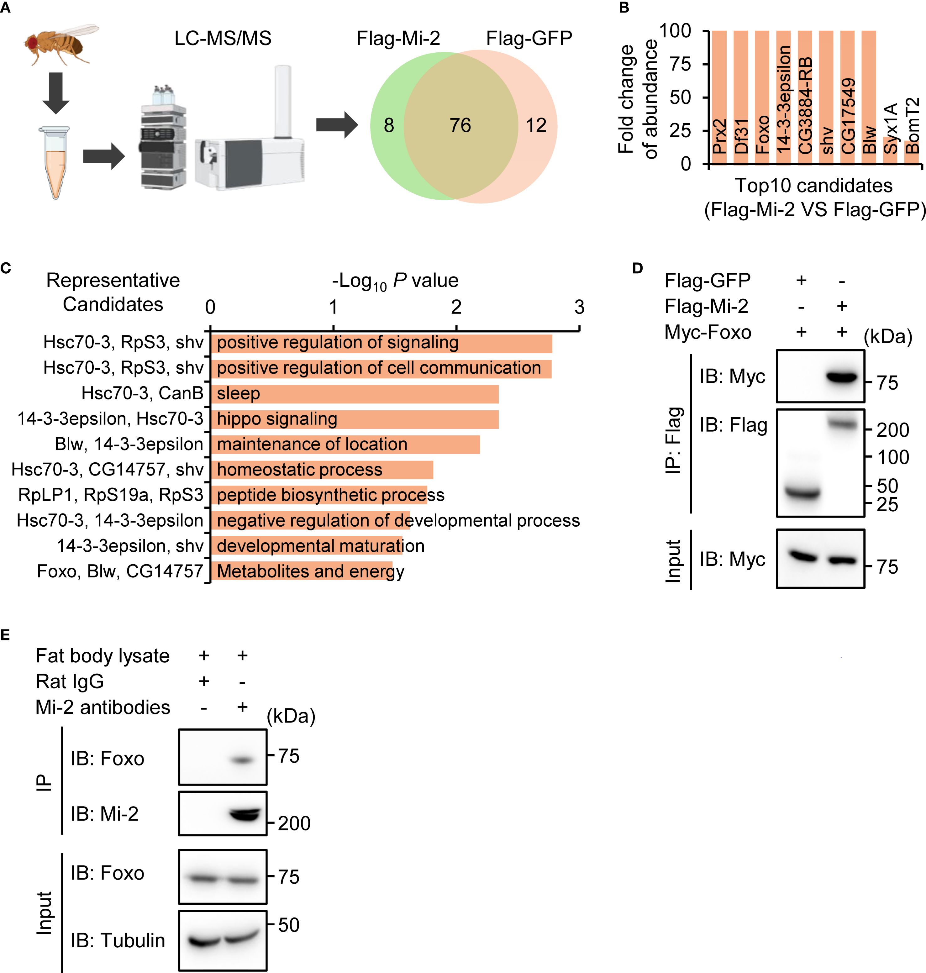 Figure 3. Mi-2 physically interacts with Foxo. (A) Schematic of IP-LC-MS/MS to identify potential Mi-2 interacting protein candidates. (B) The top 10 candidates of the Mi-2 interactome. (C) GO analysis of the Mi-2 interactome. (D) Co-IP from S2 cells expressing Flag-Mi-2 and Myc-Foxo. Input and IP blots are shown for Flag or Myc. (E) The fat body tissues were dissected from w1118 flies, followed by co-IP assays using anti-Mi-2 antibodies. Rat IgG was used in the control sample.
