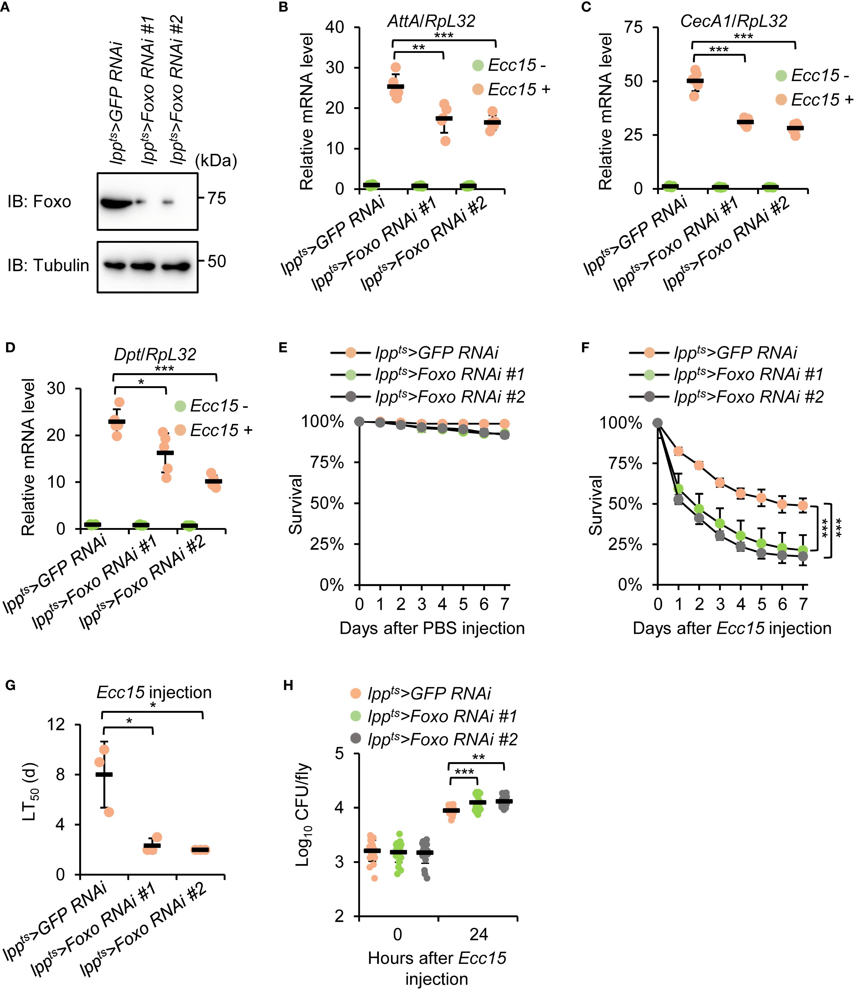 Figure 4. Foxo knockdown phenocopies Mi-2 depletion in the Drosophila antibacterial immune defense. (A) Western blots showing the knockdown efficiency of different Foxo RNAi strains. Tubulin was used as the loading control. (B-D) RT-qPCR of AMP genes in fat body-specific Foxo RNAi flies after Ecc15 infection. (E-G) Survival assays of Foxo RNAi and control flies after Ecc15 challenge. The number of flies is as follows. In E, lppts>GFP RNAi: 50, 48, 49; lppts>Foxo RNAi #1: 50, 49, 50; lppts>Foxo RNAi #2: 49, 49, 49. In F, lppts>GFP RNAi: 49, 50, 50; lppts>Foxo RNAi #1: 48, 48, 49; lppts>Foxo RNAi #2: 50, 48, 50. The time points when half of the experimental flies (F) died (LT50) were shown in (G, H) Bacterial load assays at 24 h after Ecc15 infection. In (B–D), data were collected from 5 independent replicates and shown as means plus standard errors. In (E–G), data were collected from 3 independent replicates. In (H), data were pooled from 21 independent replicates. *P < 0.05; **P < 0.01; ***P < 0.001.
