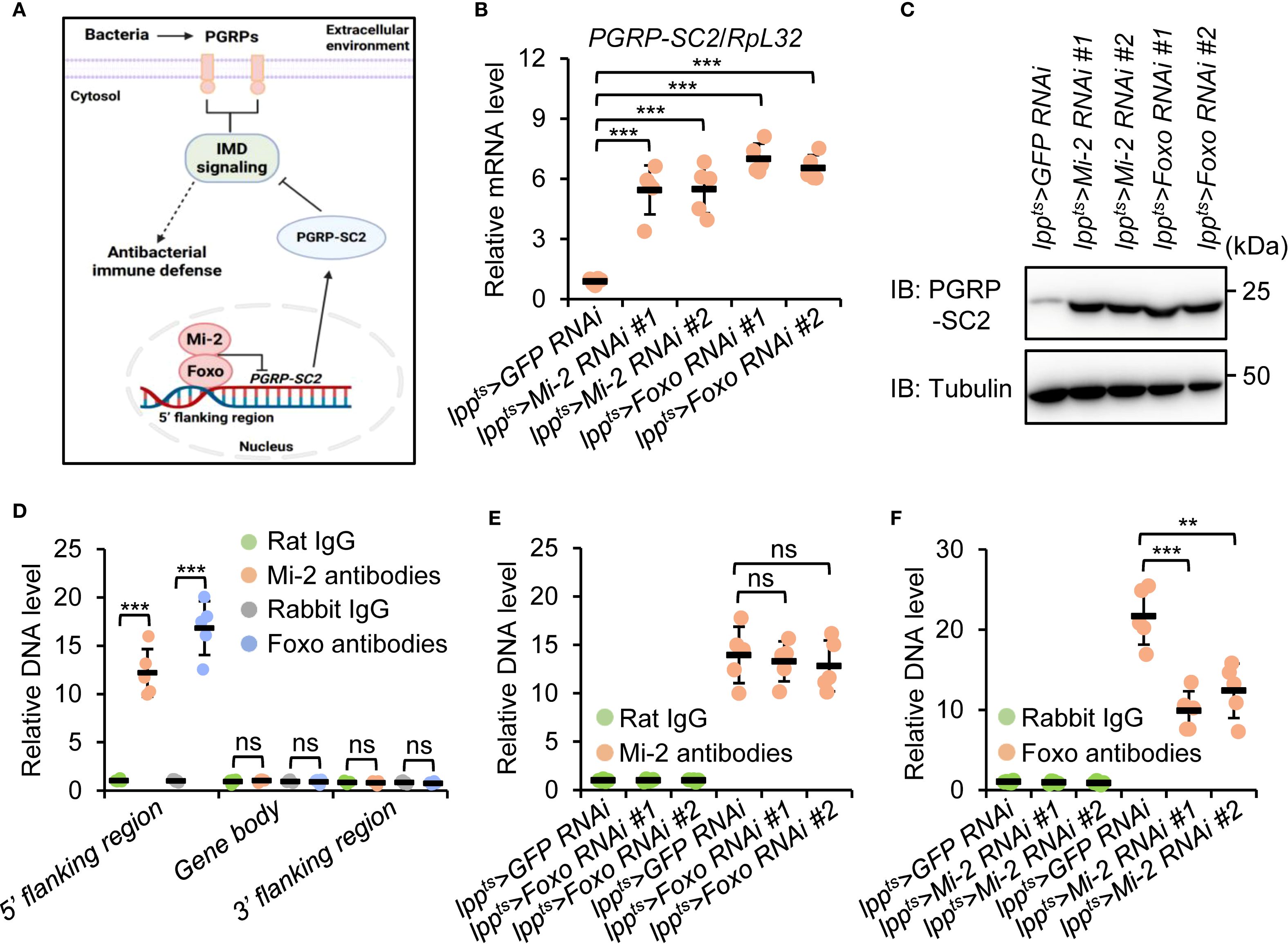 Figure 5. Mi-2 and Foxo antagonize PGRP-SC2 expression in the Drosophila fat body. (A) The diagram illustrating a working model in which Drosophila Mi-2 forms a functional complex with Foxo and prevents the expression of PGRP-SC2, thereby ensuring a robust immune response upon bacterial challenge. (B, C) RT-qPCR (B) and Western blot (C) assays validating the expression levels of PGRP-SC2 in the fat body dissected from indicated flies. (D-F) ChIP-qPCR experiments showing the enrichment of Mi-2 and Foxo at different regions of PGRP-SC2. In (B, D–F), data were collected from 5 independent replicates and shown as means plus standard errors. **P < 0.01; ***P < 0.001; ns, not significant.