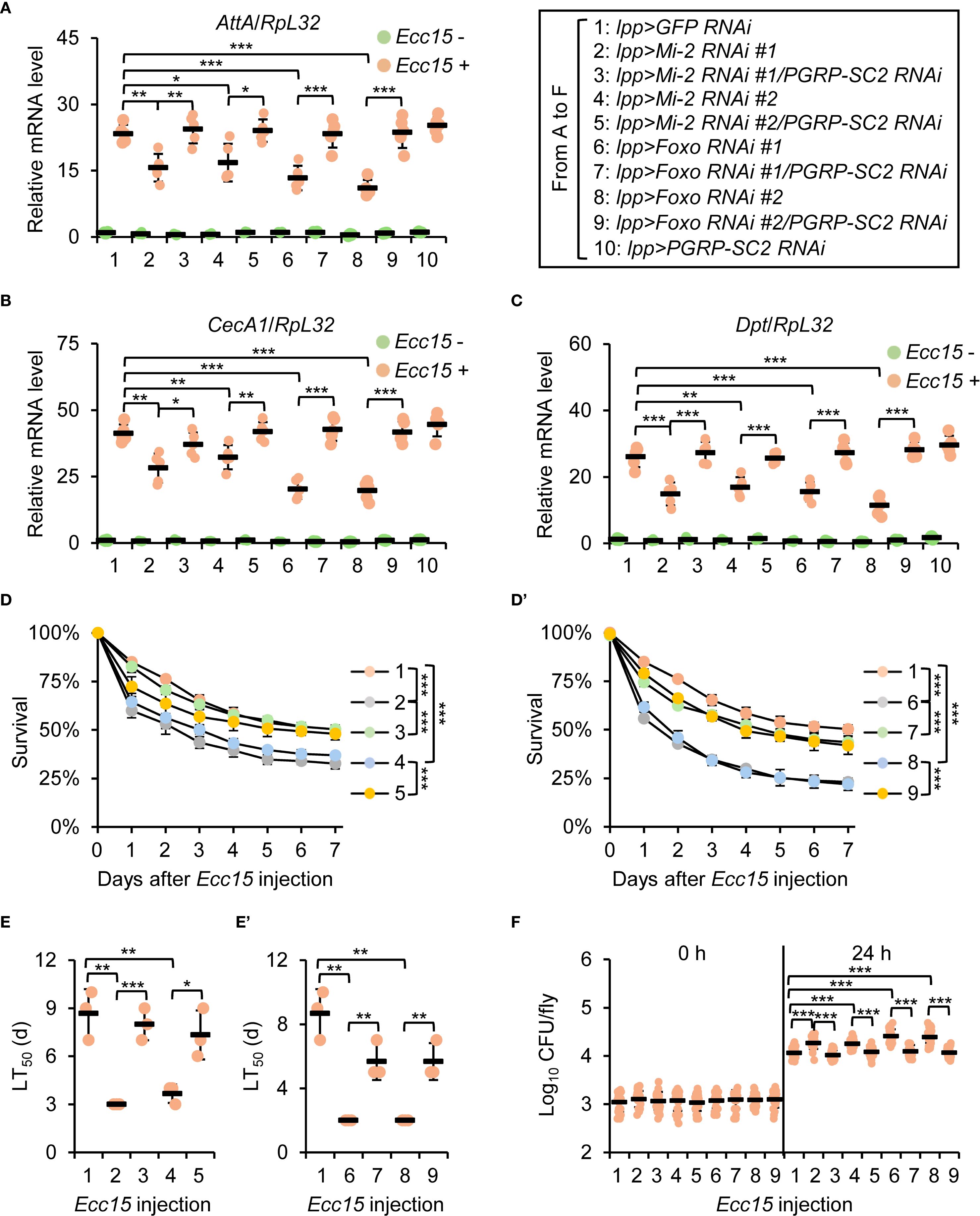 Figure 6. Genetic interaction between Mi-2/Foxo and PGRP-SC2. (A-C) RT-qPCR of AMPs in double knockdown of Mi-2;PGRP-SC2 or Foxo;PGRP-SC2, compared to single knockdown. (D-E’) Survival curves comparing Mi-2 RNAi, Foxo RNAi, and double RNAi flies. The number of flies is as follows. In (D), lpp>GFP RNAi: 49, 48, 50; lpp>Mi-2 RNAi #1: 48, 50, 49; lpp>Mi-2 RNAi #1;PGRP-SC2 RNAi: 49, 50, 50; lpp>Mi-2 RNAi #2: 48, 48, 50; lpp>Mi-2 RNAi #2;PGRP-SC2 RNAi: 49, 50, 49. In D’, lpp>GFP RNAi: 49, 48, 50; lpp>Foxo RNAi #1: 50, 49, 48; lpp>Foxo RNAi #1;PGRP-SC2 RNAi: 49, 48, 50; lpp>Foxo RNAi #2: 50, 48, 49; lpp>Foxo RNAi #2;PGRP-SC2 RNAi: 50, 49, 48. The time points when half of the experimental flies (D, D’) died (LT50) are shown in (E, E’), respectively. (F) Bacterial load assays in indicated flies. In (A–C), data were collected from 5 independent replicates (10 flies for each replicate) and shown as means plus standard errors. In (D–E’), data were collected from 3 independent replicates. In (F), data were pooled from 21 independent replicates (10 flies for each replicate). *P < 0.05; **P < 0.01; ***P < 0.001.