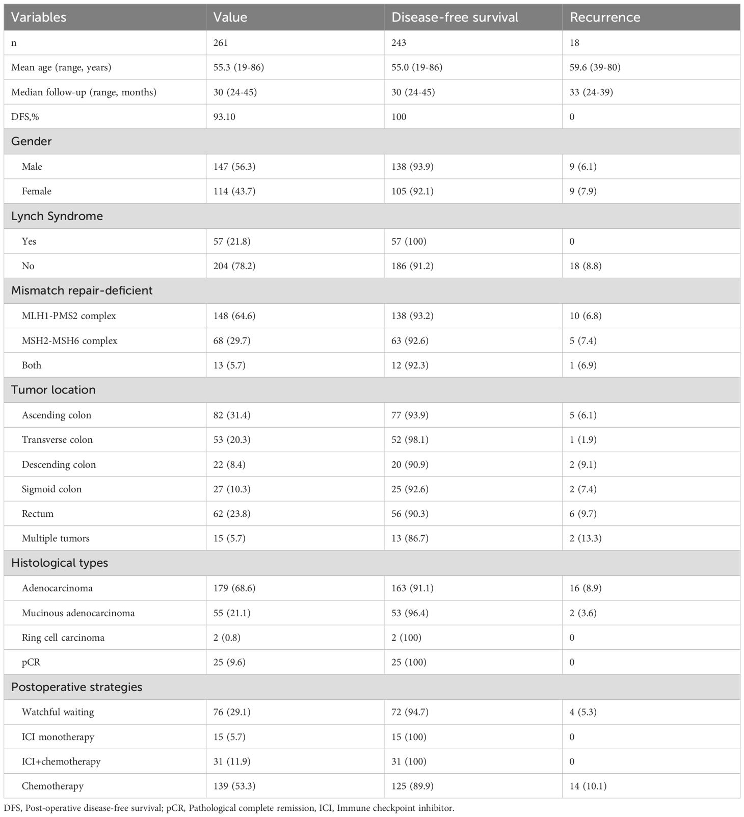 Among 261 patients included in the retrospective analysis, 147 (56.3%) were male and 114 (43.7%) female. The mean age was 55.3 range from 19 to 86 years old. The median follow-up time was 30 range from 24 to 45 months. During the follow-up period, no disease-related deaths occurred, and 18 patients (6.9%) experienced recurrence, with an overall DFS rate of 93.1% and the median DFS not reached. According to revised Bethesda criteria and germline mutation confirmation (25), 57 patients (21.8%) were Lynch syndrome, and dMMR occurred in 148 patients (64.6%) in MLH1-PMS2 complex, 68 (29.7%) in MSH2-MSH6 complex and 13 (5.7%) in both. Postoperative WW, ICI monotherapy, ICI+chemotherapy, and conventional chemotherapy patients are 76 (29.1%), 15 (5.7%), 31 (11.9%), 139 (53.3%) respectively. All the 18 patients with postoperative recurrence were Lynch-negative patients. See Table 1 for details.