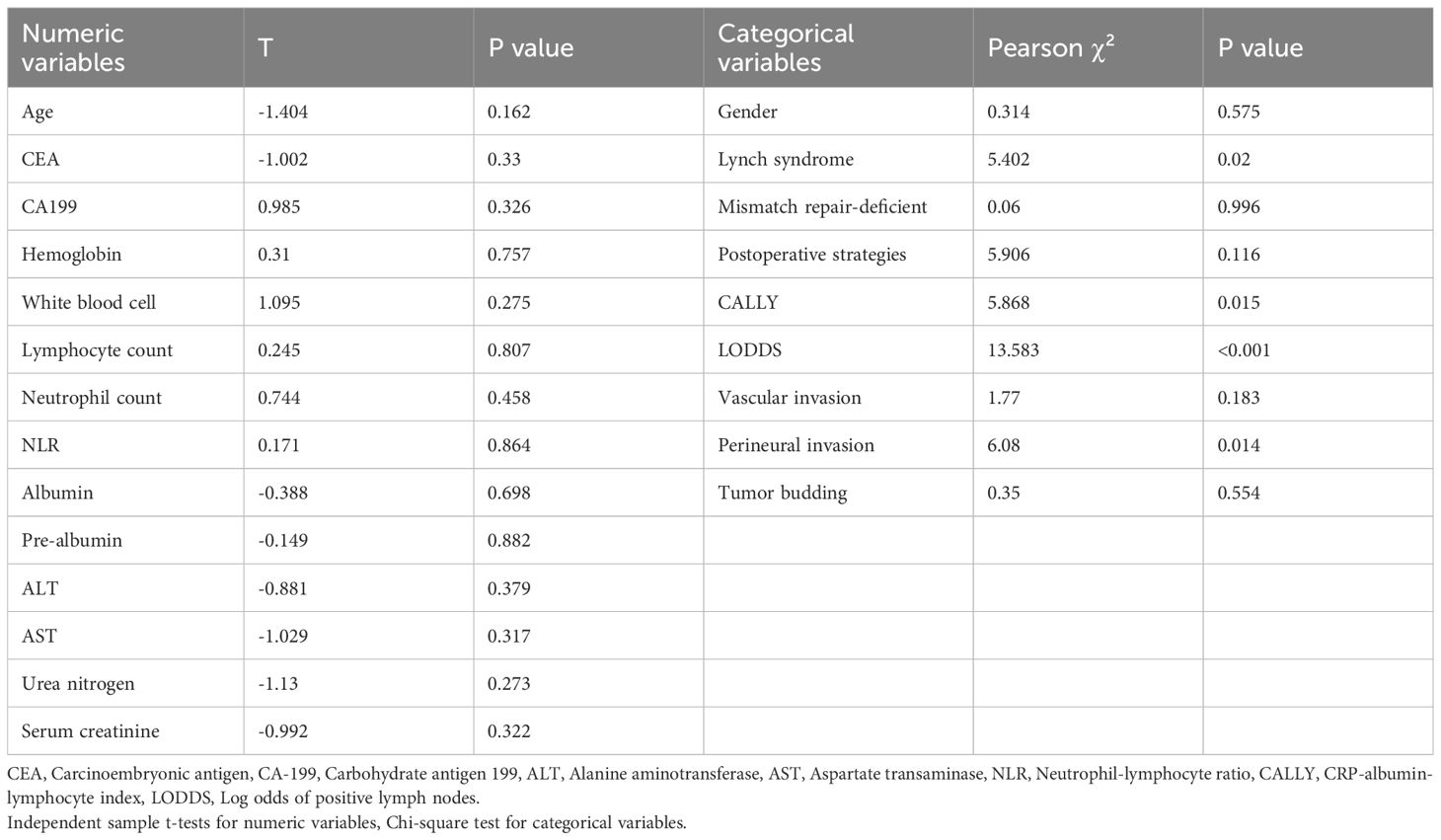 Complete demographic and clinicopathological information of patients cohort were collected, including gender, age, diagnosis, tumor location, histological type, clinical and pathological stage, TNM stage, whether Lynch syndrome, whether preoperative neoadjuvant therapy, postoperative pathology, postoperative strategies etc. Morning fasting blood samples collected within 24 hours of admission included: serum carcinoembryonic antigen (CEA), carbohydrate antigen 199 (CA-199), complete blood count (white blood cells [WBC], hemoglobin, neutrophils, lymphocytes, biochemical panel (albumin, pre-albumin, alanine aminotransferase [ALT], aspartate transaminase [AST], serum creatinine [Scr], and blood urea nitrogen [BUN]). We also calculated inflammatory index named CRP-albumin-lymphocyte index(CALLY) and log odds of positive nodes (LODDS), a lymph node marker calculated as log of the ratio between the number of positive nodes and the number of negative nodes, both of which were reported as prognostic predictors previously (21, 22).