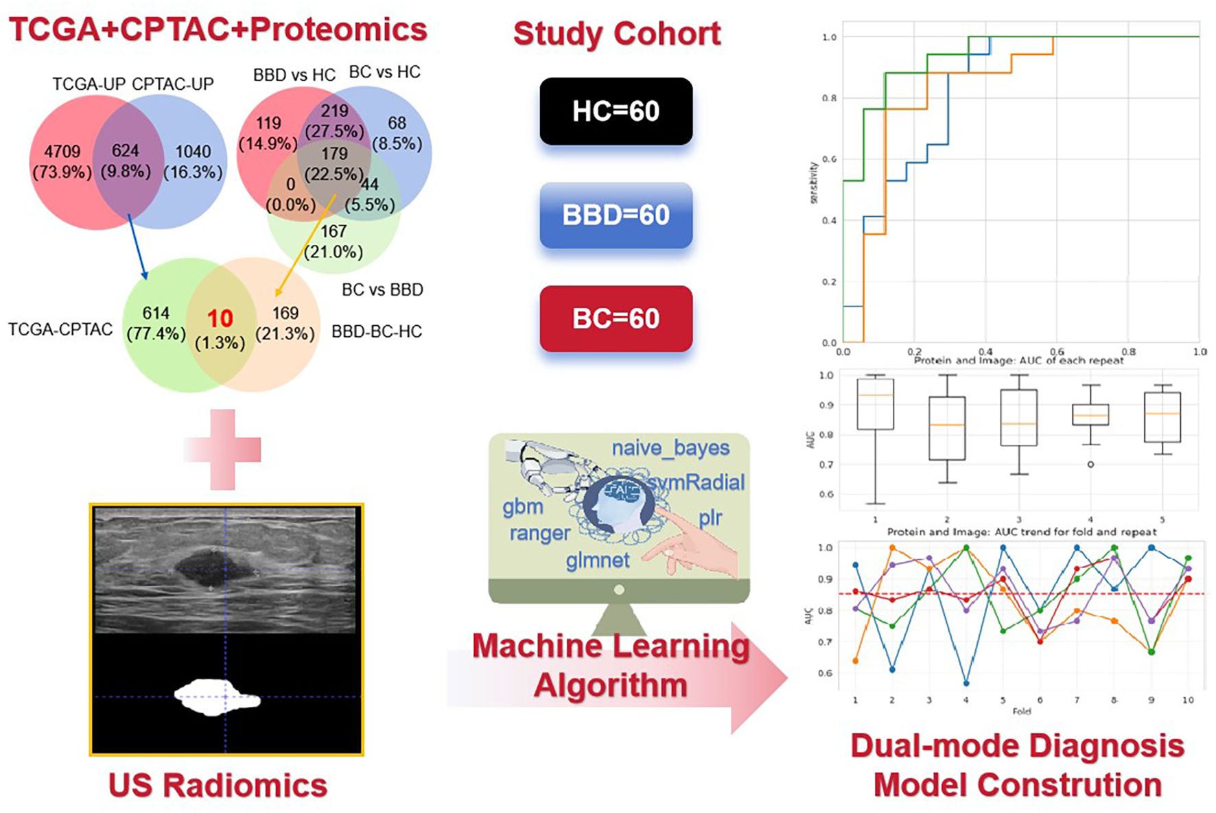 Figure 1. The flowchart of the key steps from data collection to model construction and performance evaluation. It illustrates the integration of ultrasound (US) radiomics from breast images and plasma proteomics data (The intersection was taken from TCGA + CPTAC + Proteomics) based on a study cohort (60 healthy controls [HC], 60 benign breast disease [BBD], 60 breast cancer [BC] patients), and the application of machine learning algorithms to construct a dual-mode diagnostic model.