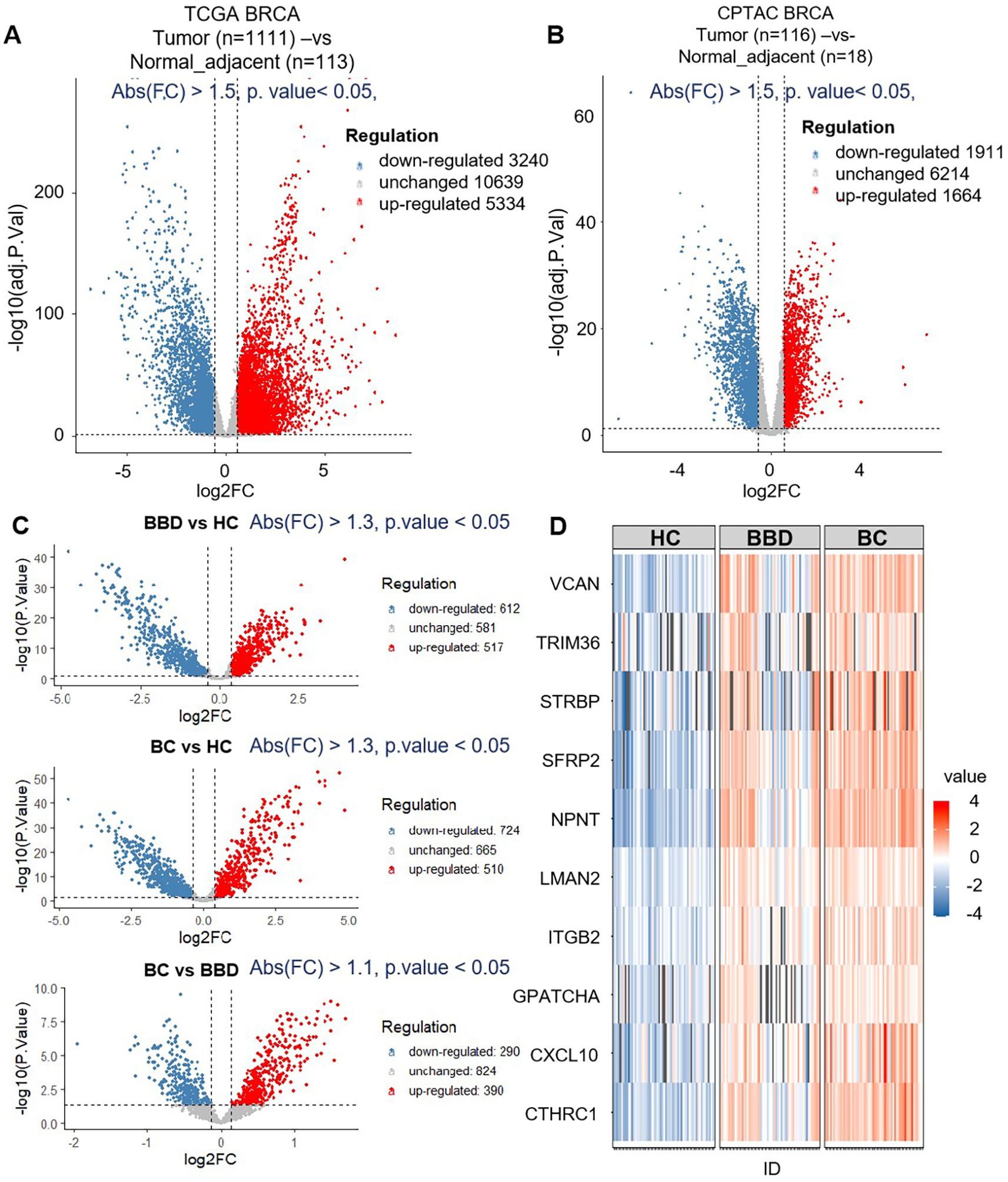 Figure 2. The results of biomarker discovery from the dataset (TCGA+CPTAC) and proteomics. (A) The volcano plot of breast tumor (n=1111) and normal adjacent (n=113) in TCGA. (B) The volcano plot of breast tumor (n=116) and normal adjacent (n=18) in CPTAC. (C) The volcano plot of differential expression proteins of healthy control (HC, n=60), benign breast disease (BBD, n=60) and breast cancer (BC, n=60) by data-independent acquisition (DIA) proteomics. (D) Venn diagram of the number of differentially expressed genes and differentially expressed proteins between TCGA, CPTAC and proteomics data.