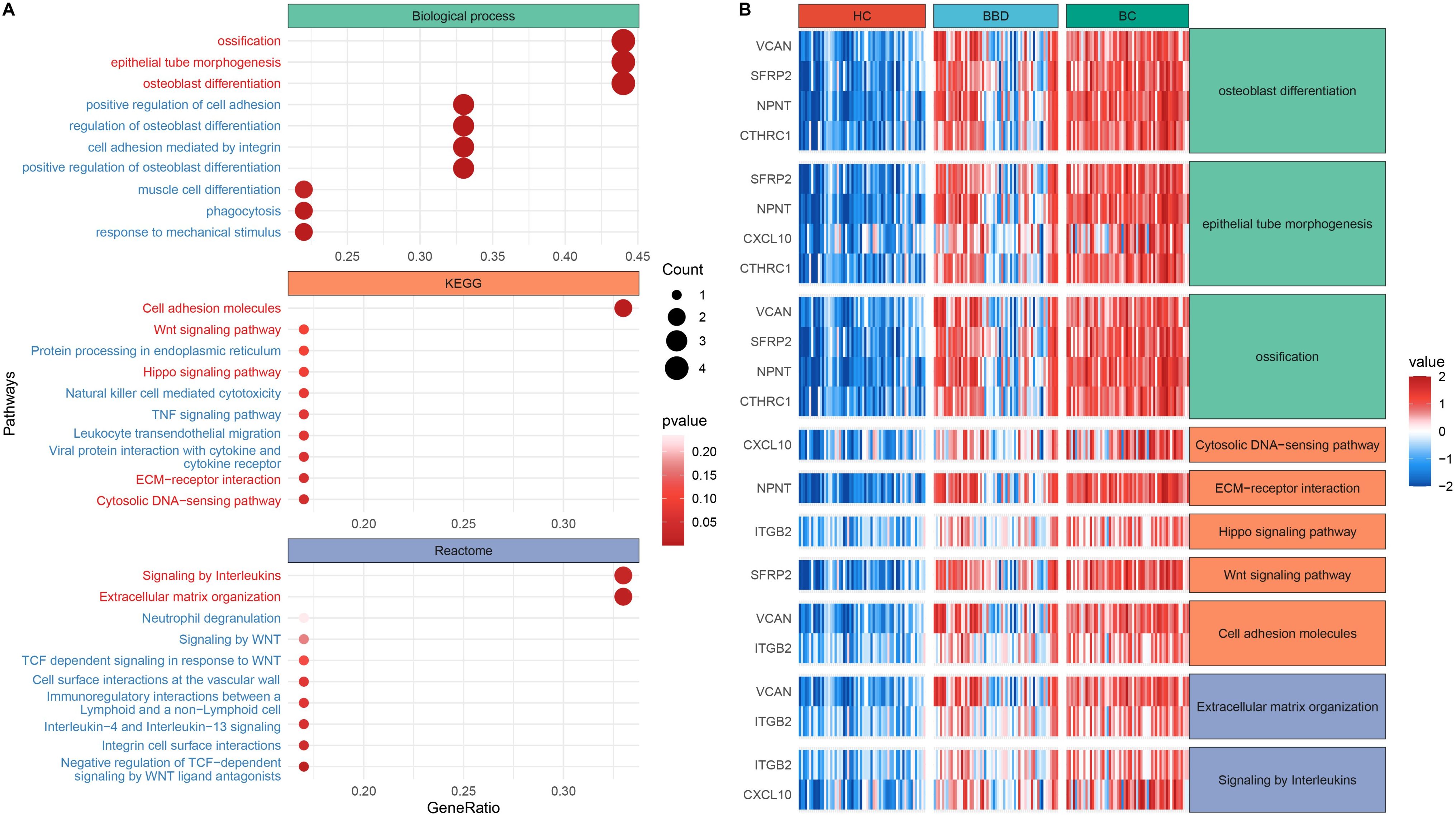 Figure 3. Functional enrichment analysis of candidate biomarkers. (A) Dot plot of enriched biological processes and pathways. (B) Expression heatmap across clinical groups.