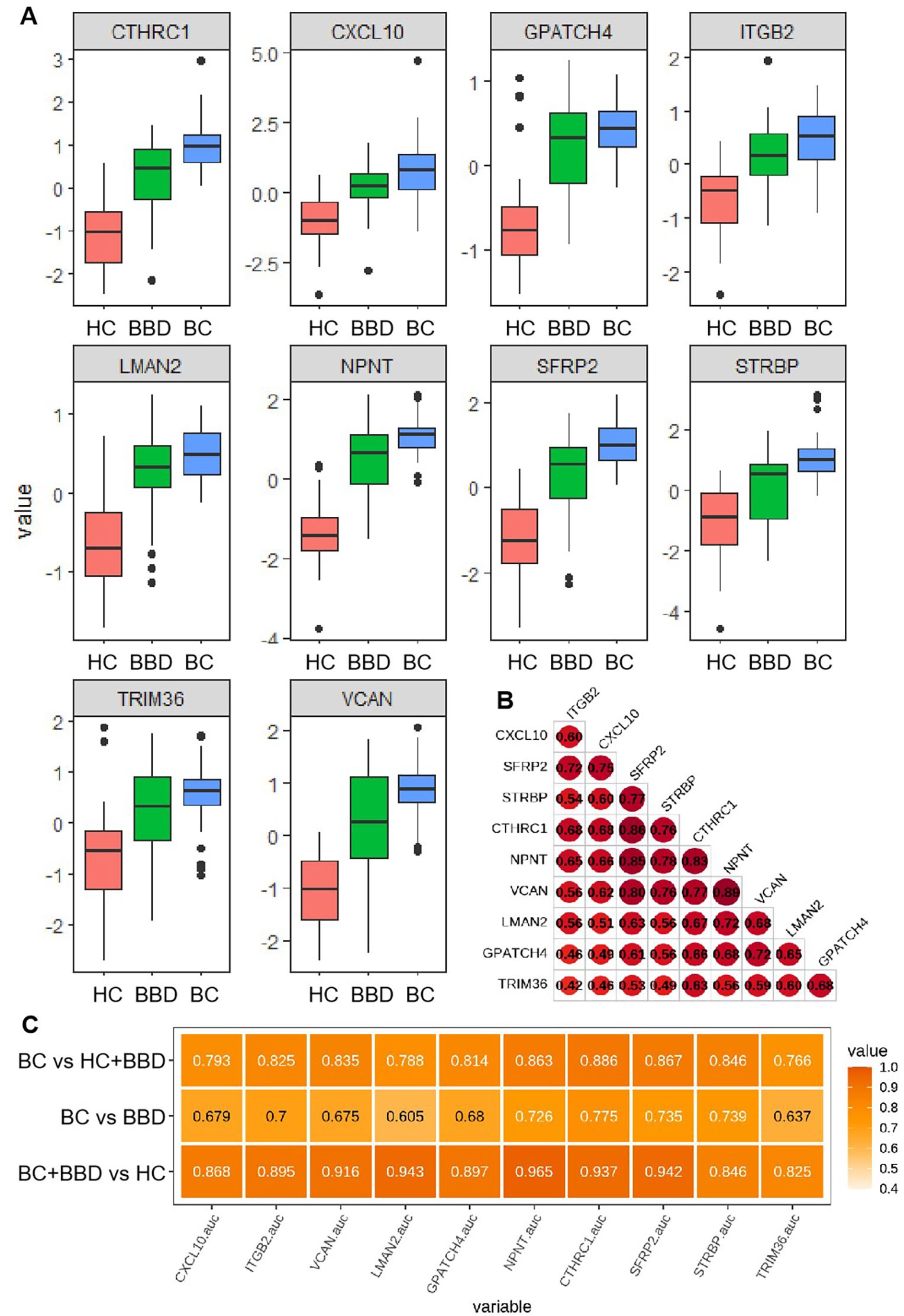 Figure 4. (A) Distribution of plasma expression levels for 10 candidate biomarkers across three groups (HC, BBD, BC). (B) Expression correlation matrix among the candidate biomarkers. (C) Performance comparison of individual candidate biomarkers in distinguishing different cohorts.