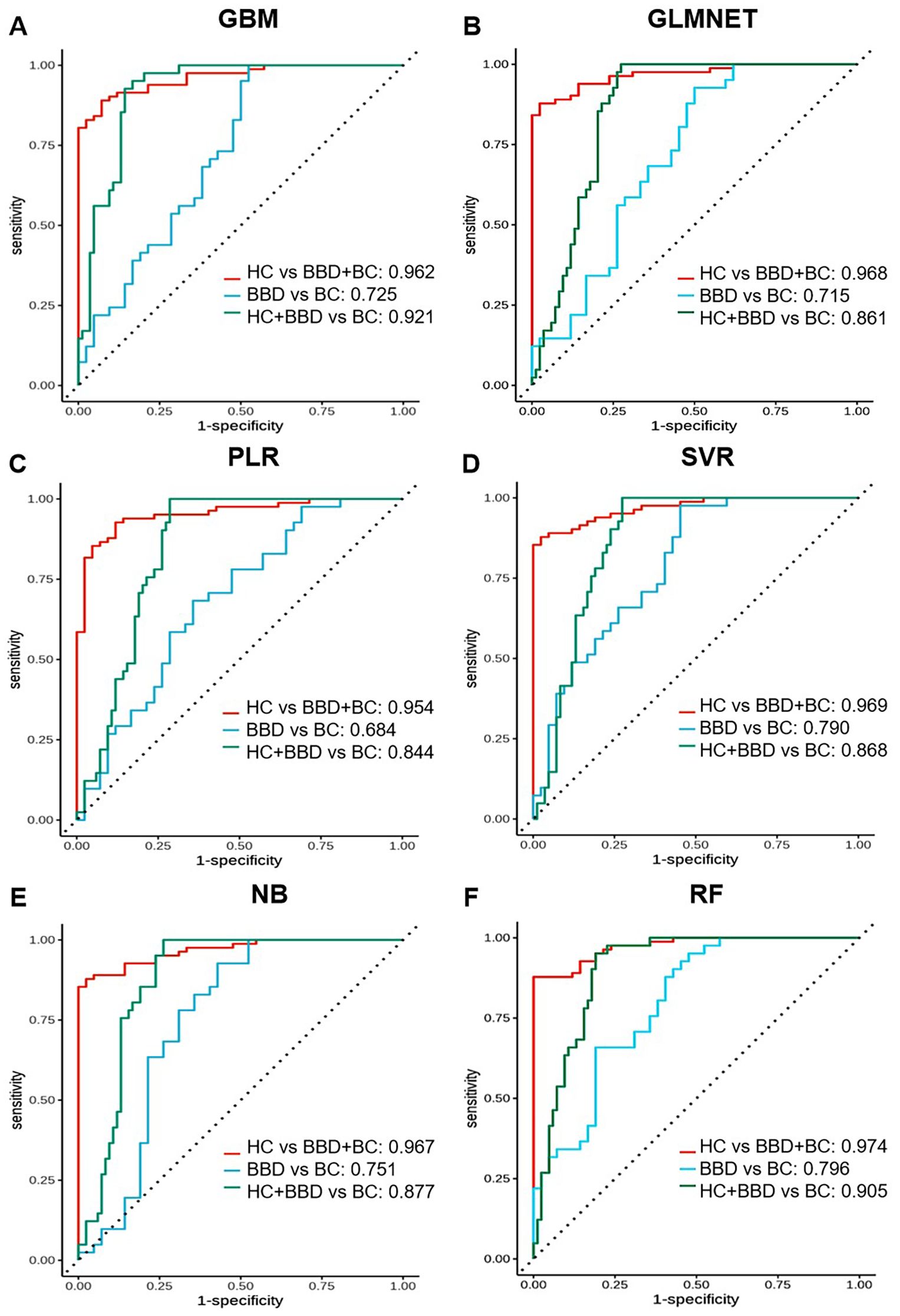 Figure 5. Performance comparison of multi-marker panels based on 10 candidate biomarkers combined with machine learning algorithms. ROC curves are shown for different algorithms in distinguishing different groups (HC vs BBD + BC, BBD vs BC, HC + BBD vs BC). Each sub-figure (A-F) corresponds to the performance of one algorithm.