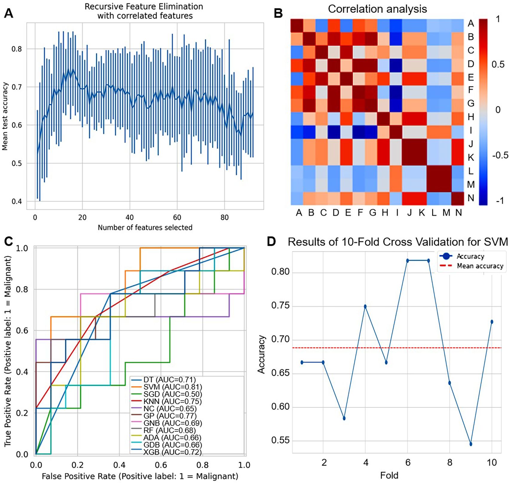 Figure 6. Development of ultrasound radiomics-based models. (A) Recursive feature elimination (RFE) plot shows the mean test accuracy as a function of the number of selected radiomic features. (B) Correlation heatmap of radiomic features (labeled A-N). Red indicates positive correlation, and blue indicates negative correlation. (C) ROC curves compare the performance of different machine learning classifiers for distinguishing malignant (label=1) cases. (D) Line plot shows the accuracy of 10-fold cross-validation for SVM across different folds. The red dashed line represents the mean accuracy.