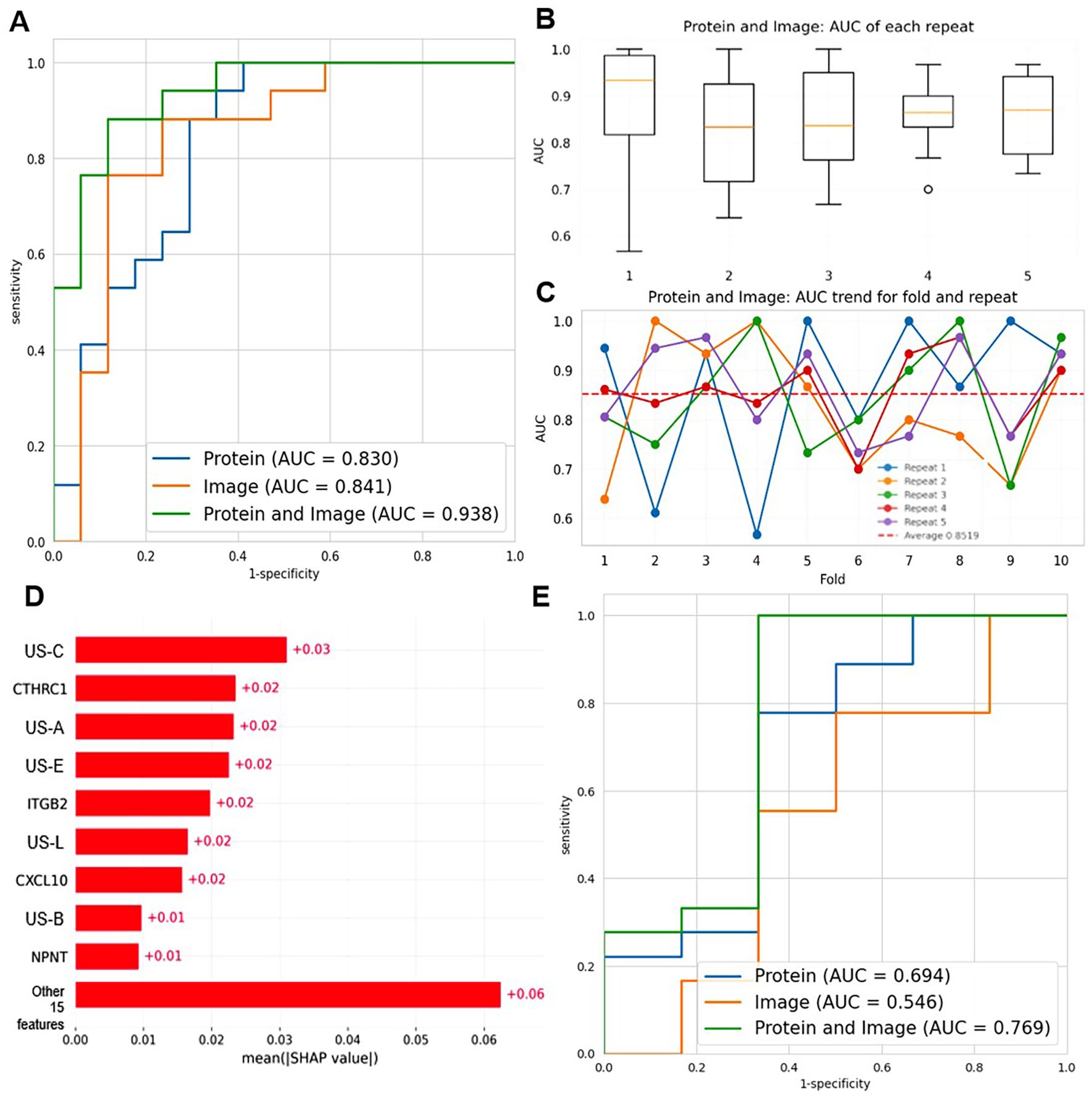 Figure 7. Construction of the dual-modal diagnostic model combining 10 protein biomarkers and 14 radiomic features. (A) ROC curves compare the diagnostic performance of protein-only (AUC = 0.830), image-only (AUC = 0.841), and protein+image (AUC = 0.938) models based on SVM. (B) Boxplots show the AUC distribution of the protein+image model across 5 repeats. (C) The line graph depicts the AUC trend of the protein + image model for 10 folds and 5 repeats. Each color represents a different repeat, and the red dashed line represents the average AUC. (D) SHAP summary plot illustrating the mean absolute SHAP values of features in the dual-modal model. (E) ROC curves comparing the diagnostic performance of protein-only (AUC = 0.694), image-only (AUC = 0.546), and protein+image (AUC = 0.769) models in a stratified analysis by BI-RADS categories (BI-RADS 3-4A vs 4B-5).