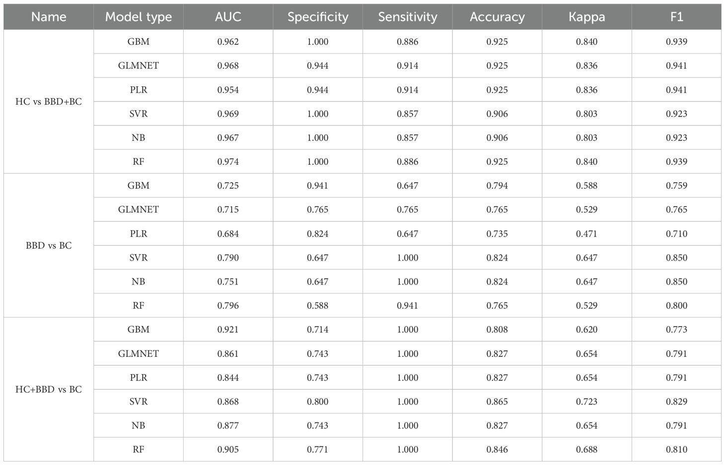 For the HC vs BBD+BC comparison, all algorithms exhibited strong diagnostic capabilities. The GBM model achieved the highest AUC of 0.962, coupled with perfect specificity (1.000), high sensitivity (0.886), and accuracy (0.925). The GLMNET and PLR models also performed well, with AUC values of 0.968 and 0.954, respectively, and accuracy reaching 0.925. The SVR model showed a high AUC of 0.969 and perfect specificity (1.000), while the NB and RF models had AUCs of 0.967 and 0.974, along with high accuracy and specificity. In the BBD vs BC, which is inherently more challenging, the overall performance was lower compared to HC vs BBD+BC. The NB model stood out with an AUC of 0.751, a sensitivity of 1.000, and an accuracy of 0.824, although its specificity was relatively low at 0.647. The SVR model achieved an AUC of 0.790 and an accuracy of 0.824, while other models like GBM, GLMNET, PLR, and RF had lower AUC values, ranging from 0.684 to 0.725, indicating the difficulty in differentiating between benign and malignant breast conditions. For the HC+BBD vs BC, the models demonstrated reasonable diagnostic performance. The NB model achieved the highest AUC of 0.877, with a sensitivity of 1.000, an accuracy of 0.827, and a specificity of 0.743. The GBM model showed an AUC of 0.921, a sensitivity of 1.000, and an accuracy of 0.808. Other models, such as GLMNET, PLR, SVR, and RF, also had moderate AUC values, ranging from 0.844 to 0.905, suggesting their ability to separate the combined non-cancer group from the cancer group to some extent.