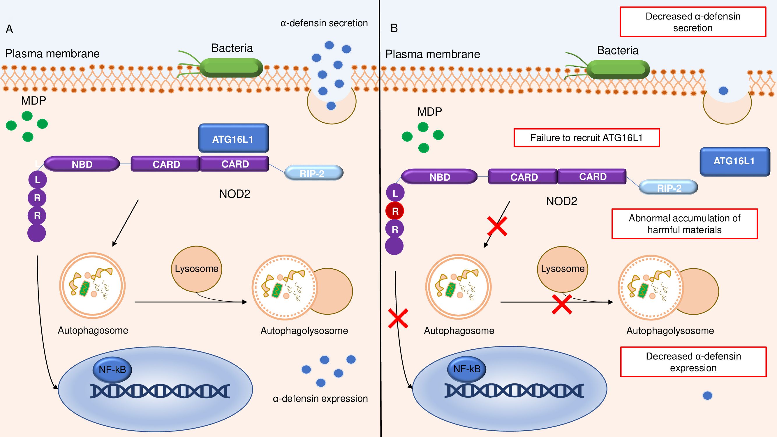 Figure 1. Schematic representation of the relationship between NOD2 and ATG16L1 in the autophagy pathway. (A) shows a normal autophagy response with recruitment of ATG16L1 to the plasma membrane by NOD2, followed by autophagosome and autophagolysosome formation and conserved α-defensine expression and secretion. (B) Altered autophagy pathway due to SNPs in leucine-rich repeat ligand-binding domain of NOD2, resulting in defective ATG16L1 recruitment, reduced autophagosome and autophagolysosome formation, and diminished intracellular bacterial killing with accumulation of harmful materials and decreased α-defensine expression and secretion. NOD2, nucleotide-binding oligomerization domain-containing 2; LRR, Leucine-Rich Repeat; NBD, nucleotide binding domain; RIP2, Receptor-Interacting Protein 2; MDP, Muramyl dipeptide; NF-kB, Nuclear Factor kappa-light-chain-enhancer of activated B cells.