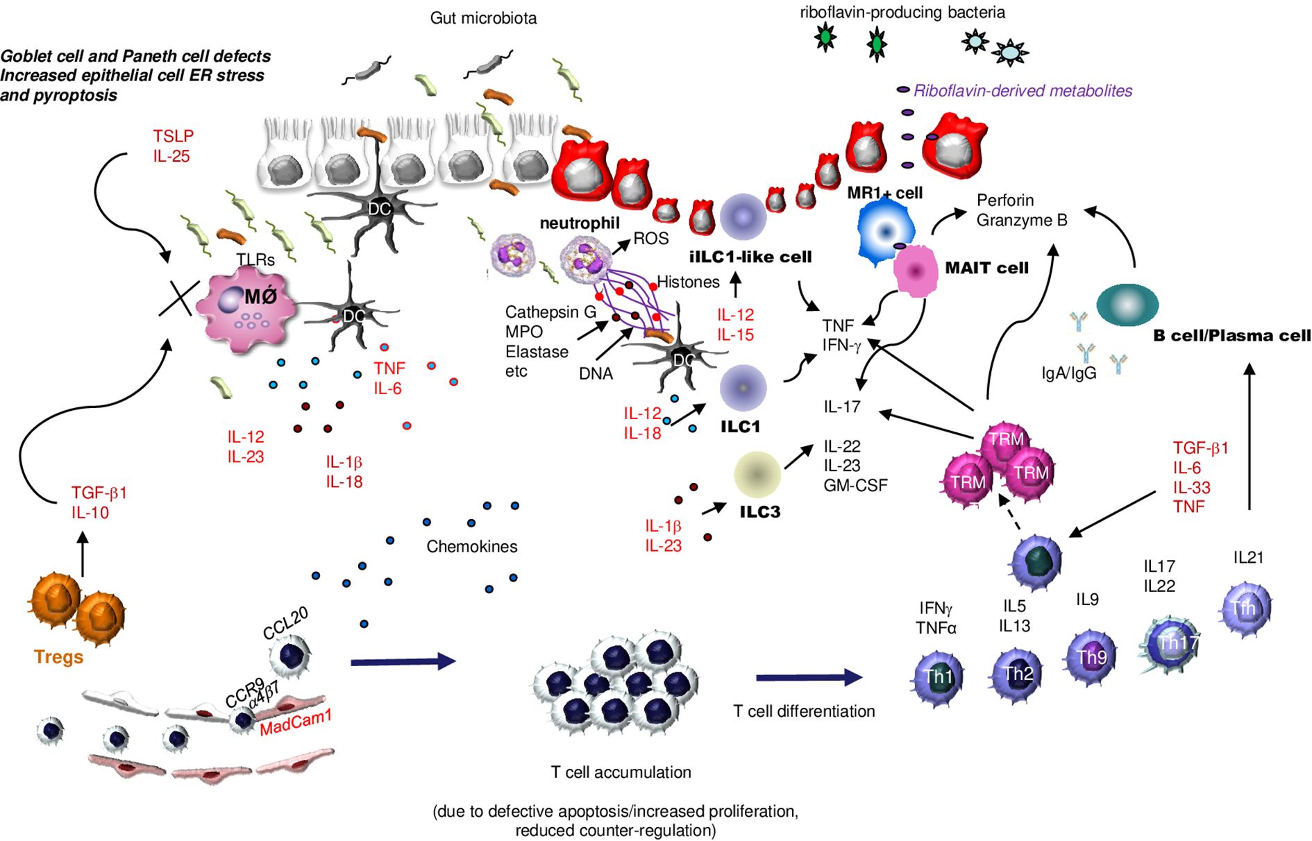 Figure 2. Schematic view of the main innate and adaptive immune cells involved in IBD pathogenesis. As a result of multiple epithelial cell defects that enhance translocation of luminal microorganisms into the lamina propria, antigen-presenting cells, such as dendritic cells (DC) and macrophages (MǾ produce huge amounts of various cytokines. Such a production is amplified by diminished production of epithelial cell- and regulatory T cells (Tregs)-derived counter-regulatory molecules [i.e., Thymic stromal lymphopoietin (TSLP) and interleukin (IL)-25]. The inflamed gut of IBD is also heavily infiltrated with additional innate immune cells, such as neutrophils that secrete reactive oxygen species (ROS), chemokines, and neutrophil extracellular traps (NETs), various subsets of cytokine-producing innate lymphoid cells (ILC), and mucosal-associated invariant T (MAIT) cells, the latter being activated by riboflavin-derived metabolites. T cells are recruited in the gut in response to the action of locally-produced chemokines, and this process is facilitated by interaction between integrins expressed on the lymphocyte surface (e.g., a4b7) and adhesion molecules expressed by endothelial cells (e.g., MadCam1). T cells accumulate in the lamina propria as a result of additional mechanisms, and then differentiate into various subsets, which contribute to enhancing the amount of inflammatory cytokines and to promoting IgG- and Granzyme-B-secreting plasma cell differentiation. Under the stimulus of specific effector cytokines, the activated T cells can become memory T cells, another subset of cytokine- and perforin and Granzyme B-producing T cells. ER, Endoplasmic Reticulum; TSLP, Thymic Stromal Lymphopoietin; TLR, Toll-like receptor; DC, Dendridic cell; ROS, Reactive Oxygen Species; MPO, Myeloperoxidase; ILC1, innate lymphoid cells type 1; ILC3, innate lymphoid cells type 3; TRM, Tissue-Resident Memory T cells; MR1+ cell, major histocompatibility complex (MHC) class I-related molecule 1 (MR1)-restricted T cell; MAIT cell, Mucosal-associated invariant T cells; TNF, Tumor Necrosis Factor; TGFβ1, Transforming Growth Factor β1; IL-1β, interleukin-; IL-5, interleukin-5; IL-6, interleukin-6; IL-9, interleukin-9; IL-10, interleukin-10; IL-12, interleukin-12; IL-13, interleukin-13; IL-15, interleukin-15; IL-17, Interleukin-17; IL-18, interleukin-18; IL-22, interleukin-22; IL-23, interleukin-23; IL-25, interleukin-25; IL-33, interleukin-33; IFNγ, interferon γ; TH1, T helper 1 cells; TH2, T helper 2 cells, TH9, T helper 9 cells; TH17, T helper 17 cells; Tregs, regulatory T cells; Tfh, T follicular helper cells; CCL20, C-C motif chemokine ligand 20; CCR9; MadCam1, Mucosal Addressin Cell Adhesion Molecule 1; GM-CSF, Granulocyte-Macrophage Colony-Stimulating Factor.