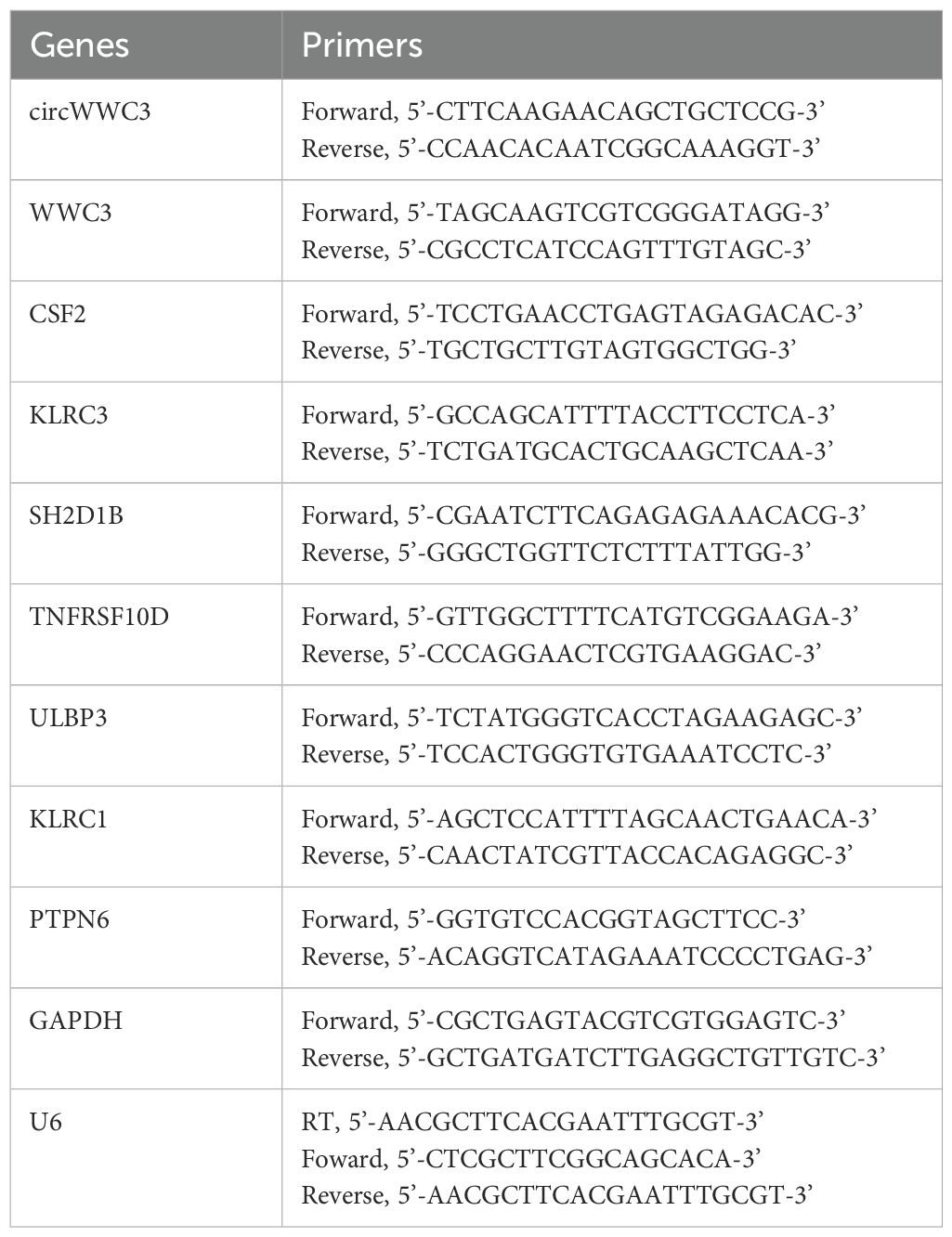 Introduction: Circular RNAs (circRNAs) have been reported to be important in the development and progression of breast cancer. Nevertheless, the biological functions and mechanisms underlying the action of circRNAs in triple-negative breast cancer (TNBC) remain poorly understood. The present study aimed to explore the role of hsa_circ_0001910 (also termed circWWC3) interacting with vimentin in regulating the secretion of Colony Stimulating Factor 2 (CSF2) and its effects on the malignant biological behavior of triple-negative breast cancer as well as the cytotoxic activity of NK cells.