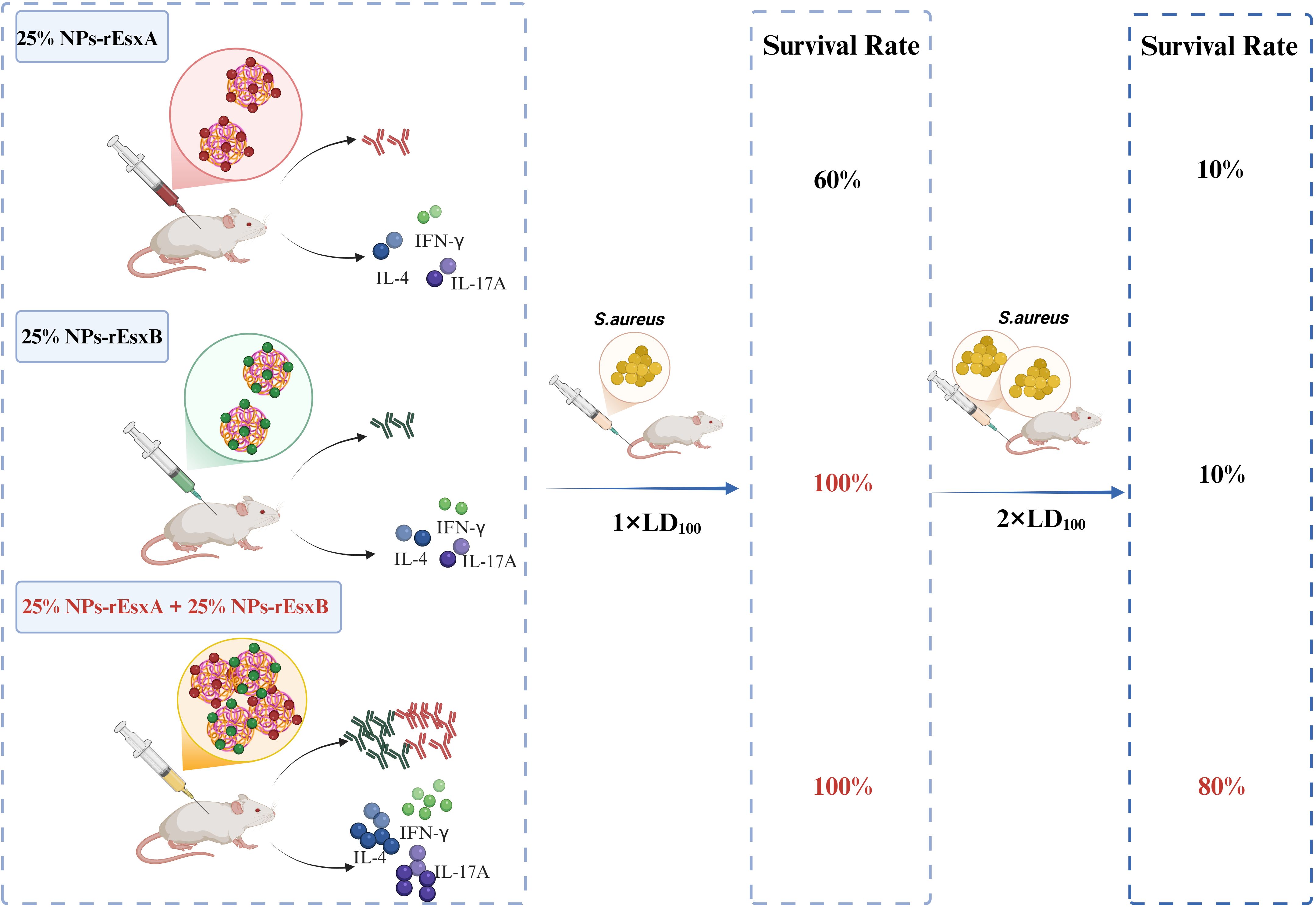Figure 1. Schematic illustration of the superior immune efficacy of combined nanovaccines. Co-administration of 25% NPs-rEsxA and 25% NPs-rEsxB elicits enhanced antibody titers and Th1/Th17 cytokine production, contributing to 100% survival against standard lethal dose and 80% survival at doubled lethal dose of S. aureus ATCC 25923. Created in BioRender (https://BioRender.com).