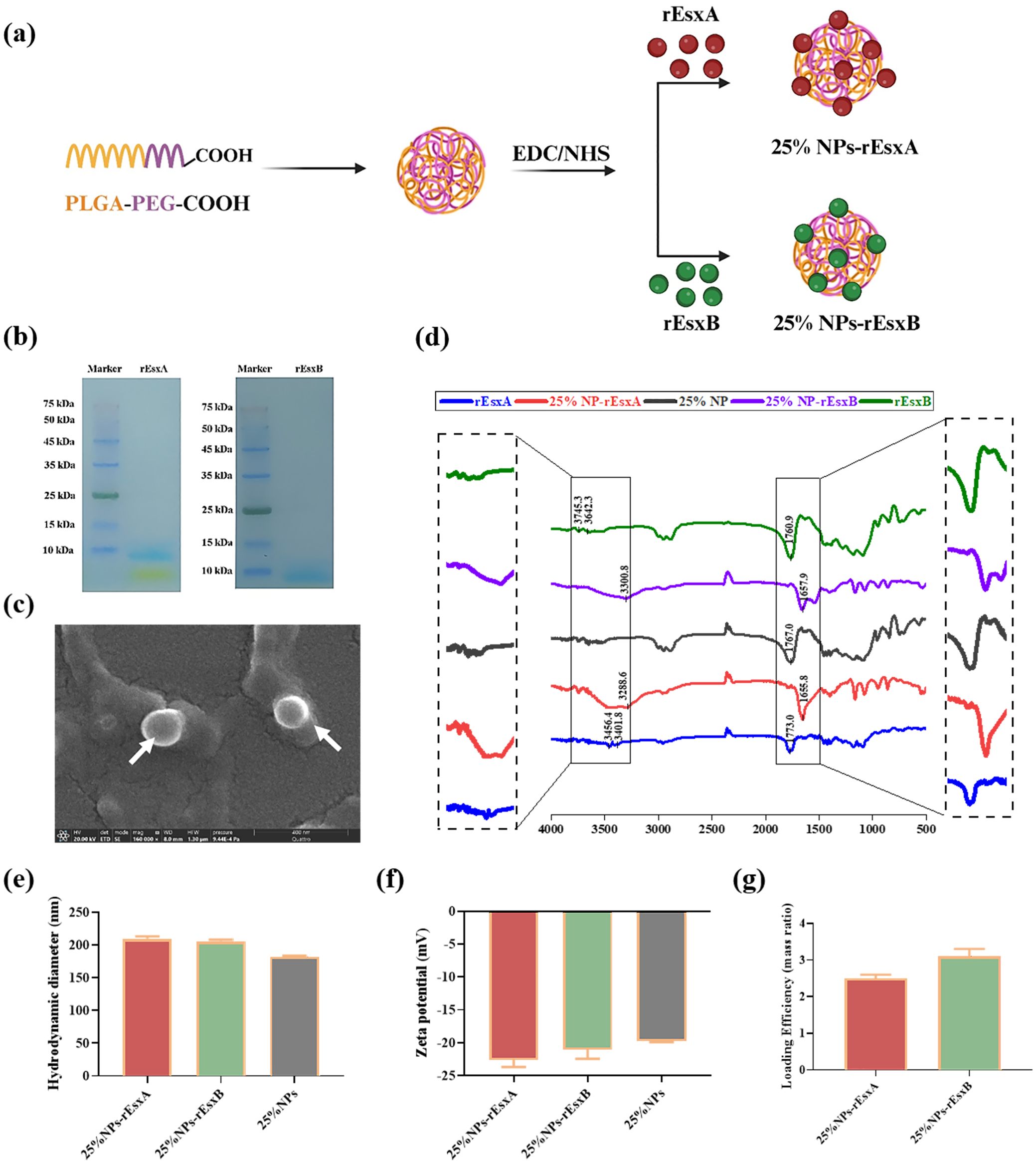 Figure 2. The design and characterization of 25% NPs nanovaccine. (a) Schematic illustration of the synthetic route for 25% NPs. (b) SDS-PAGE analysis of the rEsxA and rEsxB antigens. (c) Representative SEM image of the 25% NPs. (d) FT-IR spectra of rEsxA, rEsxB, 25% NPs, 25% NPs-rEsxA and 25% NPs-rEsxB. (e) Hydrodynamic diameter of the 25% NPs measured by DLS. (f) Zeta potential of the 25% NPs measured by DLS. (g) Loading efficiency of rEsxA and rEsxB in the 25% NPs-rEsxA or rEsxB measured by BCA.