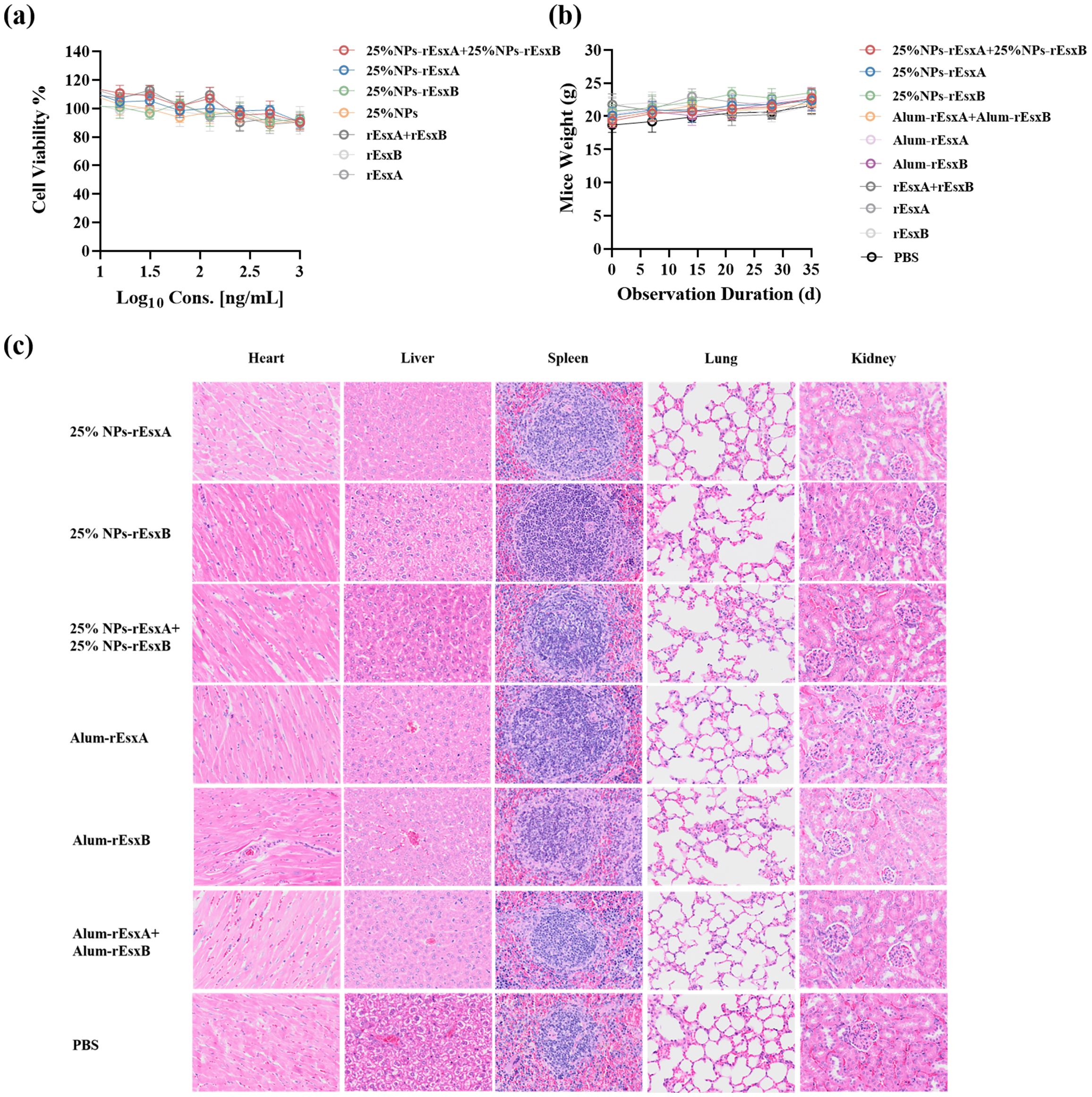 A two-part figure comprising charts and histological images. (a) A line graph showing cell viability percentage versus the logarithmic concentration of various treatments, including different combinations of nanoparticles (NPs), rExsA, and rExsB, with consistent viability across concentrations. (b) A graph depicting mice weight over a 35-day observation period under similar treatments, showing stable weights. (c) Histological images of heart, liver, spleen, lung, and kidney tissue under different treatment conditions, including various combinations of 25% NPs with rExsA and rExsB, Alum with rExsA, and PBS, illustrating tissue morphology differences.