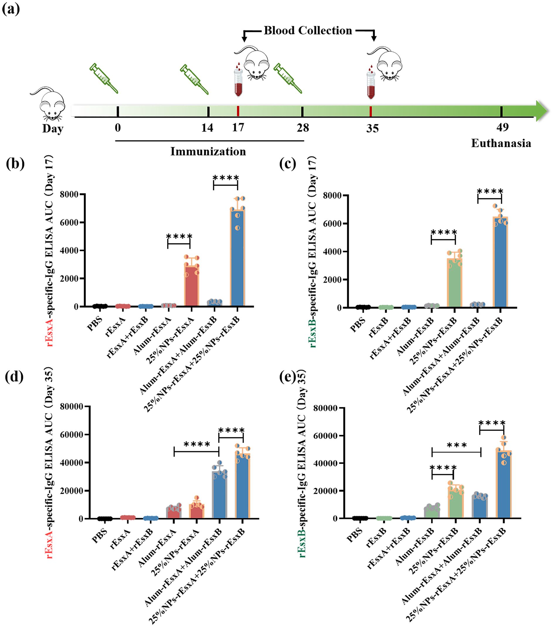 Figure 4. Potent humoral response to S. aureus antigens after S.C. vaccinations with the PLGA nanovaccines. (a) Illustration of the immunization protocol and the sampling time points. (b) rEsxA-specific serum IgG level at day 17 (n=6). (c) rEsxB-specific serum IgG level at day 17 (n=6). (d) rEsxA-specific serum IgG level at day 35 (n=6). (e) rEsxB-specific serum IgG level at day 35 (n=6). All data were expressed as mean ± S.D. A p value< 0.05 was considered as statistically significant (***p< 0.001; ****p< 0.0001).