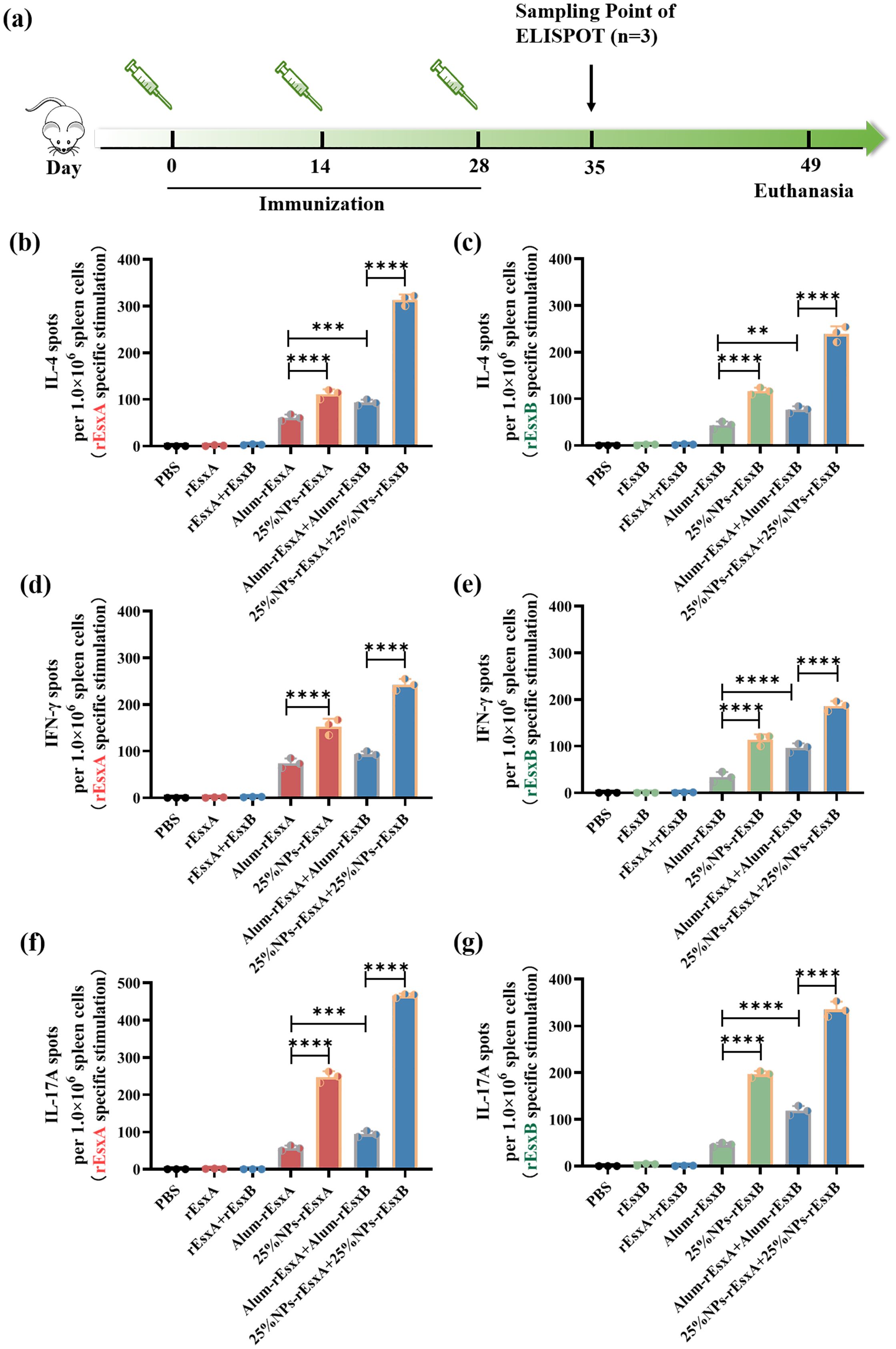 Figure 5. Potent humoral and cellular response to S. aureus antigens after S.C. vaccinations with the PLGA nanovaccines. (a) Illustration of the immunization protocol and the sampling time points. (b) IL-4 secretion by rEsxA (10 μg/mL) stimulation revealed by ELISPOT (n=3). (c) IL-4 secretion by rEsxB (10 μg/mL) stimulation revealed by ELISPOT (n=3). (d) IFN-γ secretion by rEsxA (10 μg/mL) stimulation revealed by ELISPOT (n=3). (e) IFN-γ secretion by rEsxB (10 μg/mL) stimulation revealed by ELISPOT (n=3). (f) IL-17A secretion by rEsxA (10 μg/mL) stimulation revealed by ELISPOT (n=3). (g) IL-17A secretion by rEsxB (10 μg/mL) stimulation revealed by ELISPOT (n=3). All data were expressed as mean ± S.D. A p value< 0.05 was considered as statistically significant (**p< 0.01; ***p< 0.001; ****p< 0.0001).