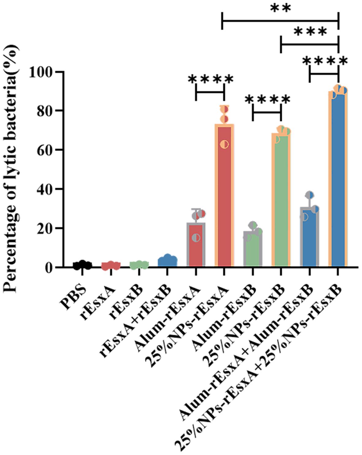 Bar graph depicting the percentage of lytic bacteria for various treatments. The treatments are listed on the X-axis, including PBS, rEsxA, rEsxB, and combinations with Alum and nanoparticles. The Y-axis measures lytic bacteria percentage from zero to one hundred percent. The highest bars are observed in treatments involving Alum with nanoparticles, indicating significantly higher lytic activity. Statistical significance is marked with asterisks, where more asterisks denote higher significance.