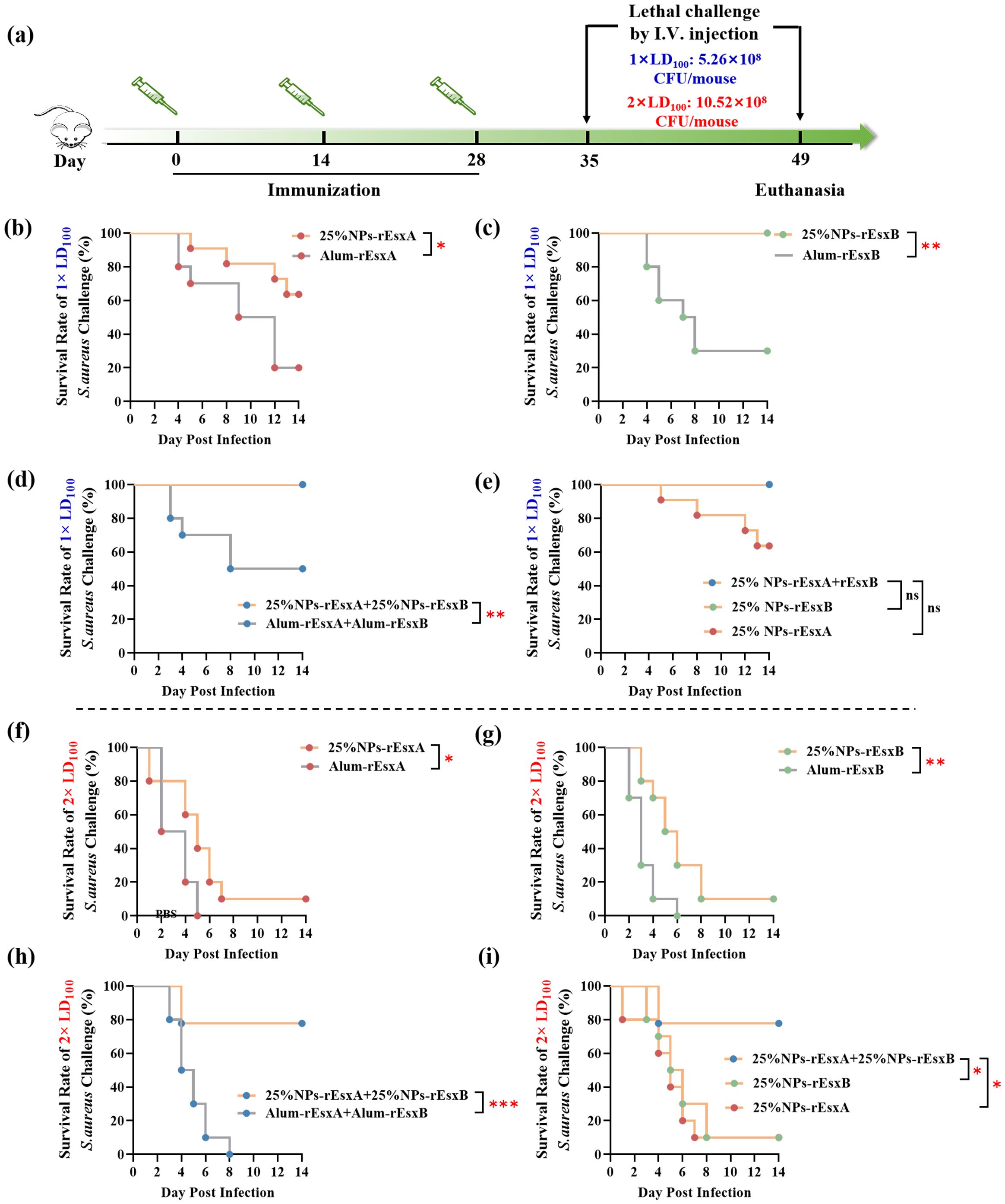 Figure 7. Protective efficacy of vaccinated BALB/c mice after S. aureus challenge. (a) Timeline for immunization, challenge and evaluation of protective efficacy. (b–e) Survival rates (n = 10) of immunized mice challenged via I.V. injection with S. aureus ATCC 25923 at a dose of 5.26 × 108 CFU. Survival rate (n = 10) of the immunized mice challenged with S. aureus ATCC 25923 strain (5.26 × 108 CFU) by I.V. injection. (f-i) Survival rates (n = 10) of immunized mice challenged via I.V. injection with S. aureus ATCC 25923 at a dose of 10.52 × 108 CFU. Survival rates were analyzed with Log-rank (Mantel-Cox) analysis. A p value < 0.05 was considered as statistically significant (* p < 0.05; ** p < 0.01; *** p < 0.001).