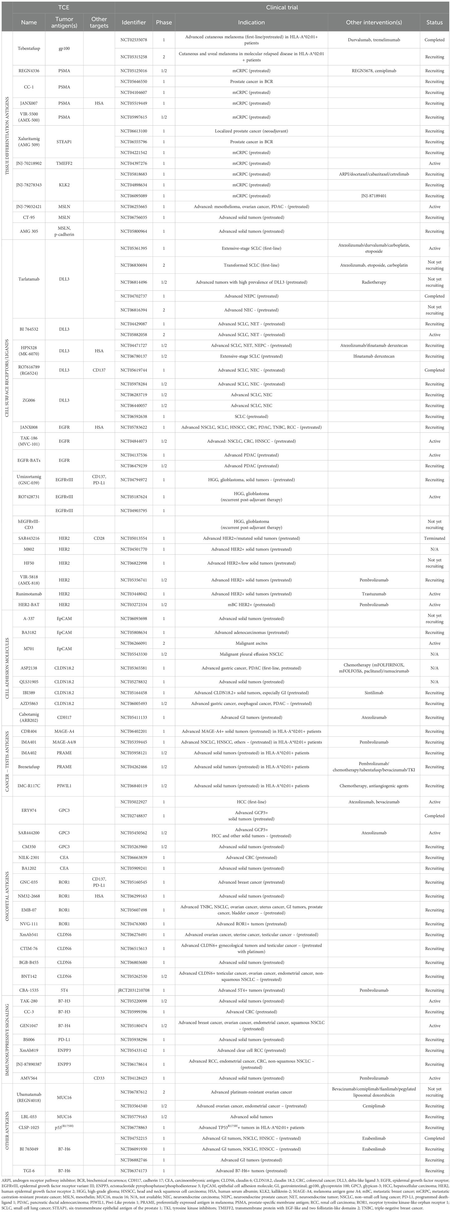 The field of TCEs is rapidly advancing, with numerous new molecules entering clinical trials. However, in solid tumors, the development of many promising agents of this class is often discontinued due to the lack of meaningful activity, leading to a situation where most TCEs do not proceed to the late stages of clinical development (9). Accordingly, we provide an updated description of the current landscape of TCEs undergoing early-phase clinical evaluation in solid tumors, with a focus on efficacy data. We identified relevant phase 1 and 2 clinical trials on ClinicalTrials.gov and PubMed. Clinical data were obtained from published articles, abstract presentations at international conferences, and press releases from the sponsors, with a cutoff date of April 30, 2025. We prioritized TCEs that are currently undergoing clinical development or whose clinical trial results have been published within the last 5 years. For ease of narrative, we grouped the different TCEs based on the specific category of the TAAs they target.