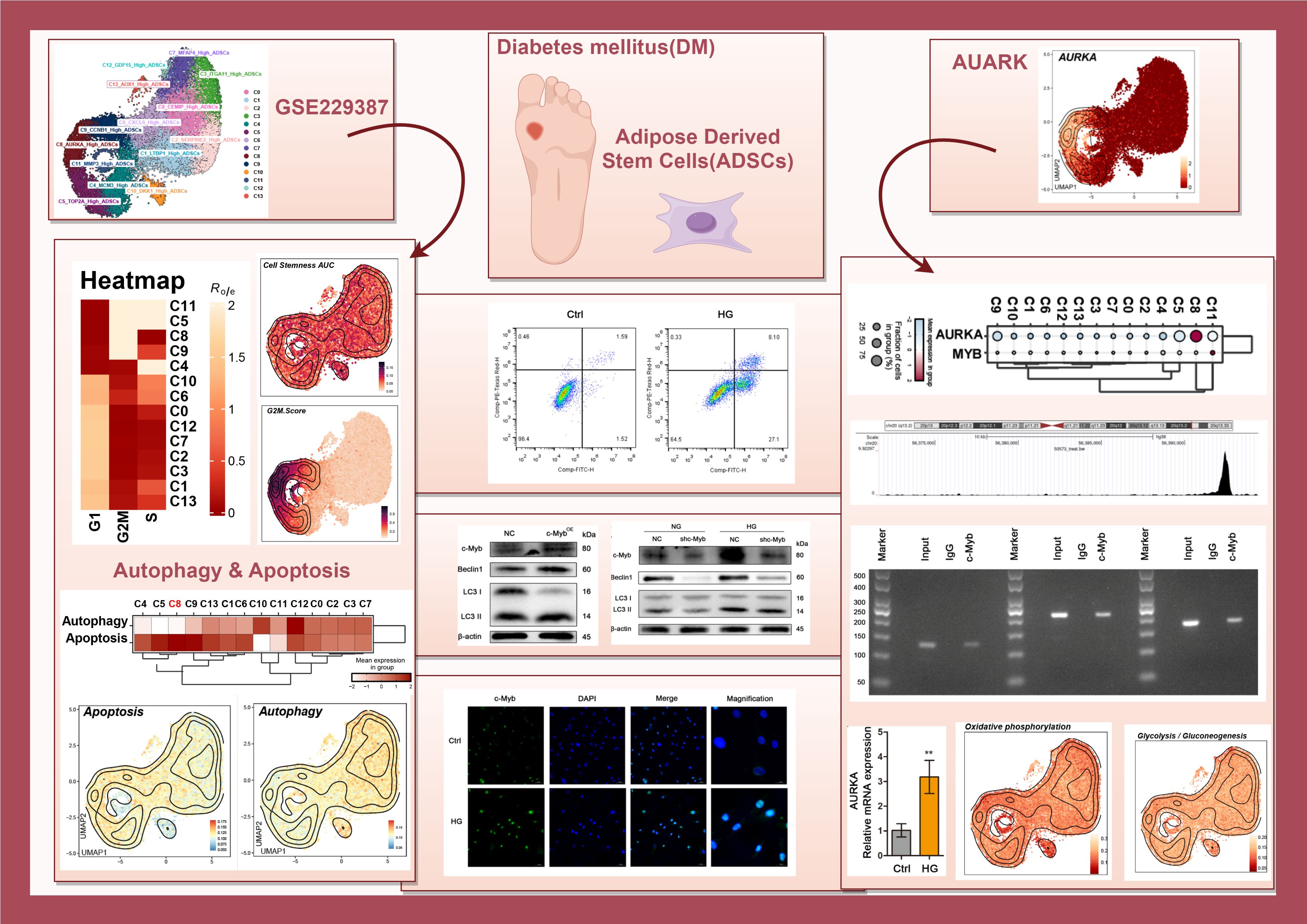 Methods: We analyzed single-cell RNA sequencing (scRNA-seq) data from ADSCs of three DM patients and three healthy donors. Subpopulations were clustered using Seurat, and functional annotations were performed via enrichment analysis. Autophagy, apoptosis, and metabolic pathways were assessed using AUCell scoring. Experimental validation was conducted using HG-treated ADSCs, including c-Myb/AURKA overexpression/knockdown, Co-IP, ChIP, and dual-luciferase reporter assays.