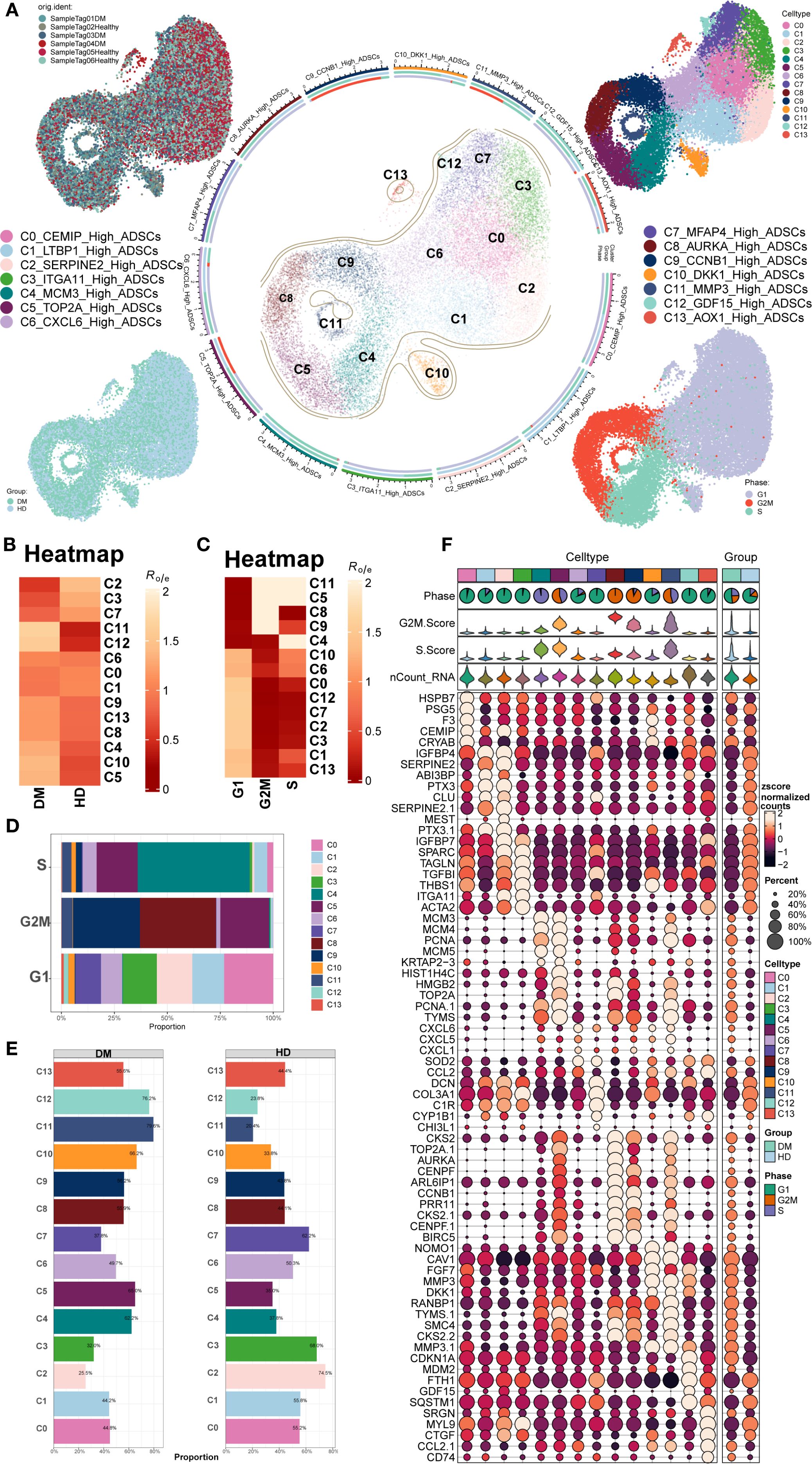 Figure 1. Overview of ADSCs subpopulations in DM. (A) The central circular plot illustrated the distribution of 14 DM ADSCs subpopulations. UMAP plots showed the sample origin, group classification (HD, healthy donor; DM, diabetes mellitus), and cell cycle phase of each cell. (B, C) The heatmaps depicted the tissue preference and cell cycle bias of the 14 DM ADSCs subpopulations. (D) The bar plot demonstrated the cell cycle distribution across the 14 DM ADSCs subpopulations. (E) The bar plot displayed the relative proportions of each ADSCs subpopulation across different groups. (F) Bubble plots presented the expression of the top five genes in each ADSCs subpopulation across different groups.