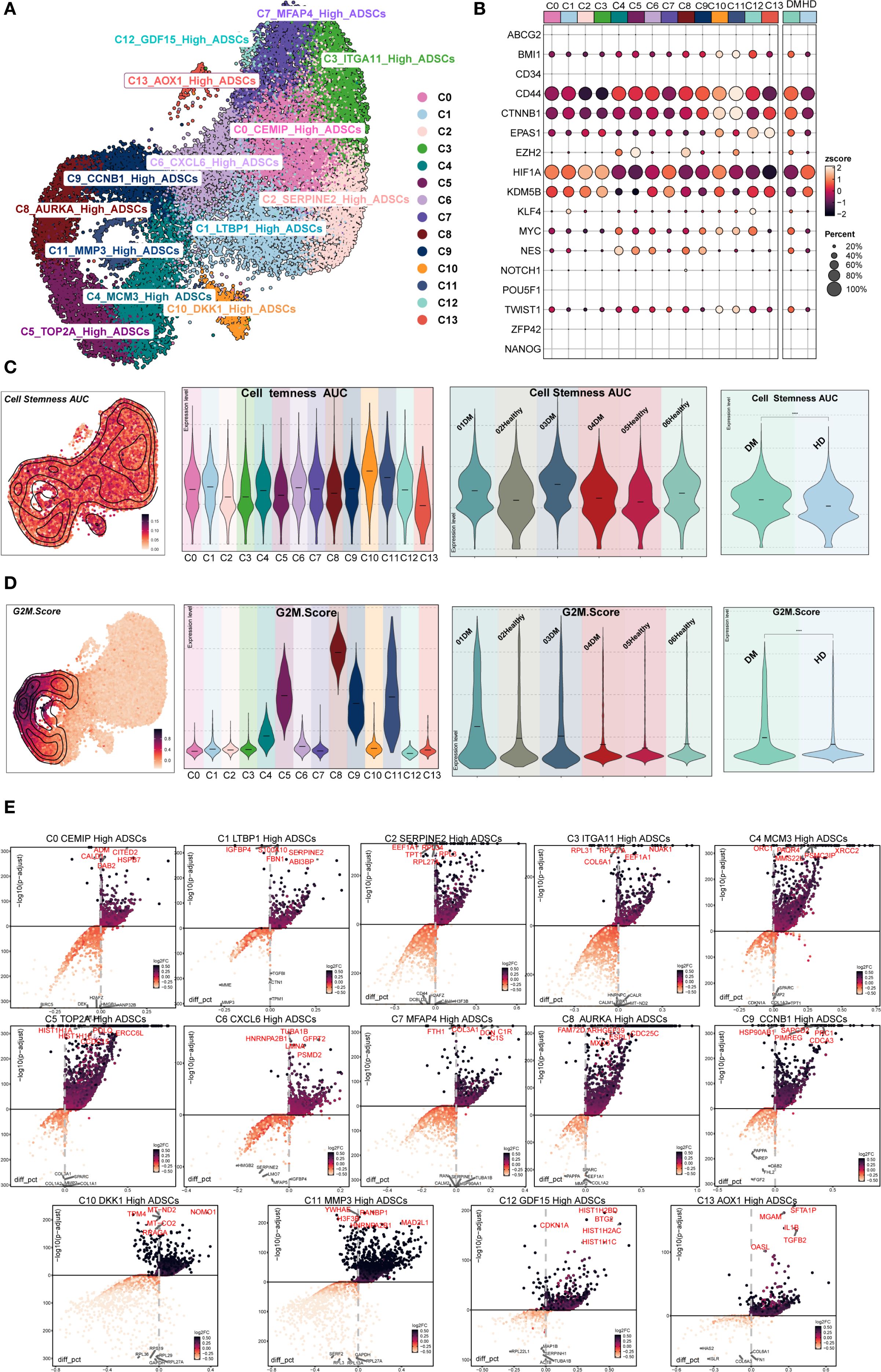 Figure 2. Stemness and differential gene expression analysis of DM ADSCs subpopulations. (A) The UMAP plot illustrated the distribution of 14 ADSCs subpopulations. (B) The bubble plot showed the expression of stemness-related genes across ADSCs subpopulations and groups. (C) The UMAP plot depicted the distribution of Cell Stemness AUC scores; violin plots presented the stemness levels across subpopulations, individual samples, and groups. (D) The UMAP plot showed the distribution of G2M scores; violin plots illustrated G2M scores across subpopulations, individual samples, and groups. (E) The volcano plots identified upregulated and downregulated genes across the 14 DM ADSCs subpopulations.