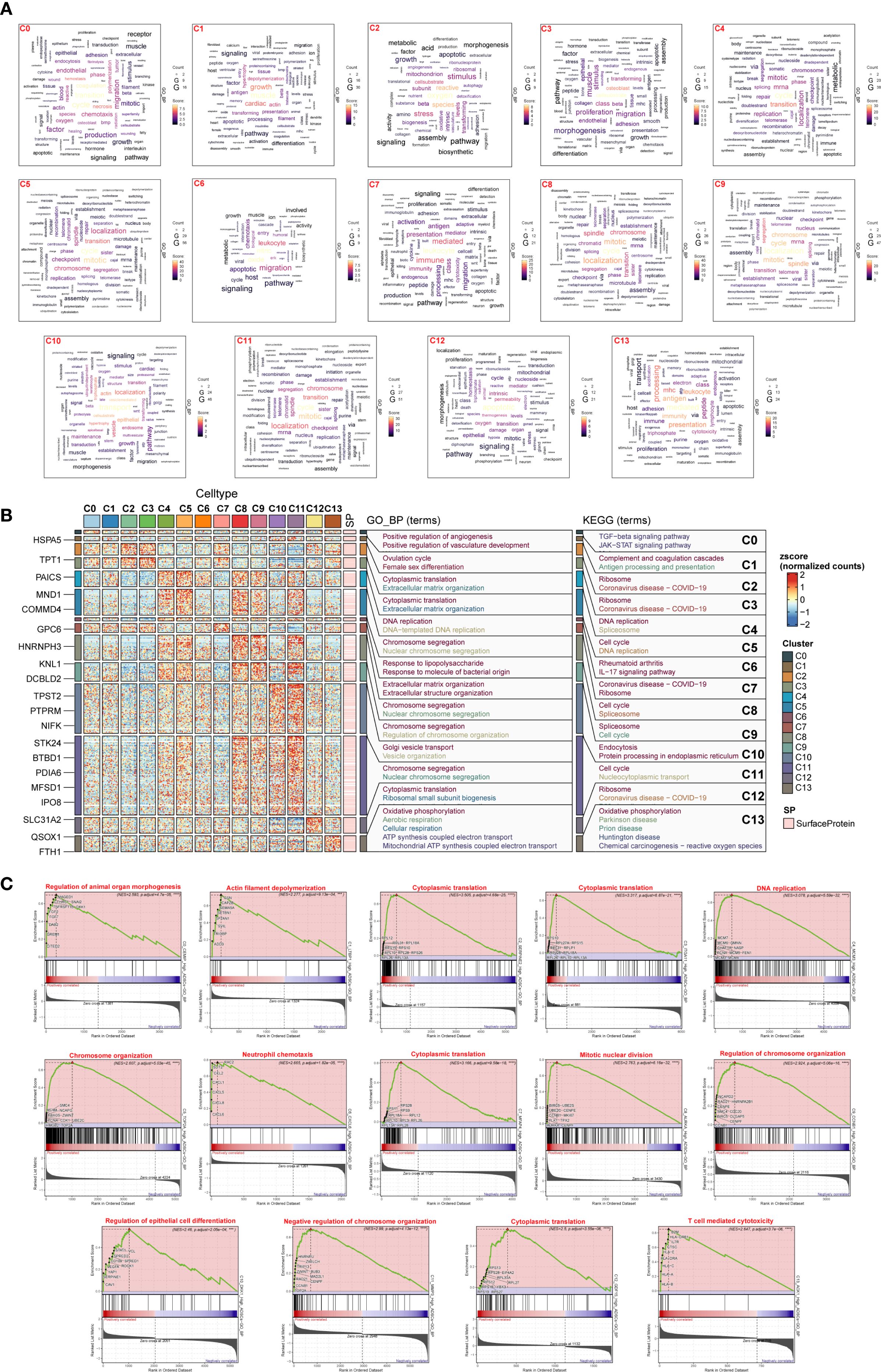 Panel A shows word clouds representing different gene clusters (C0-C13) with varying emphasis on terms such as signaling, metabolic, localization, and pathway. Panel B features a heatmap illustrating z-score-normalized counts of various proteins across cell types (C0-C13) and associated GO Biological Process and KEGG terms. Panel C presents graphs depicting gene set enrichment analysis for biological processes like cytoplasmic translation and DNA replication across cell types, with curves indicating enrichment scores.