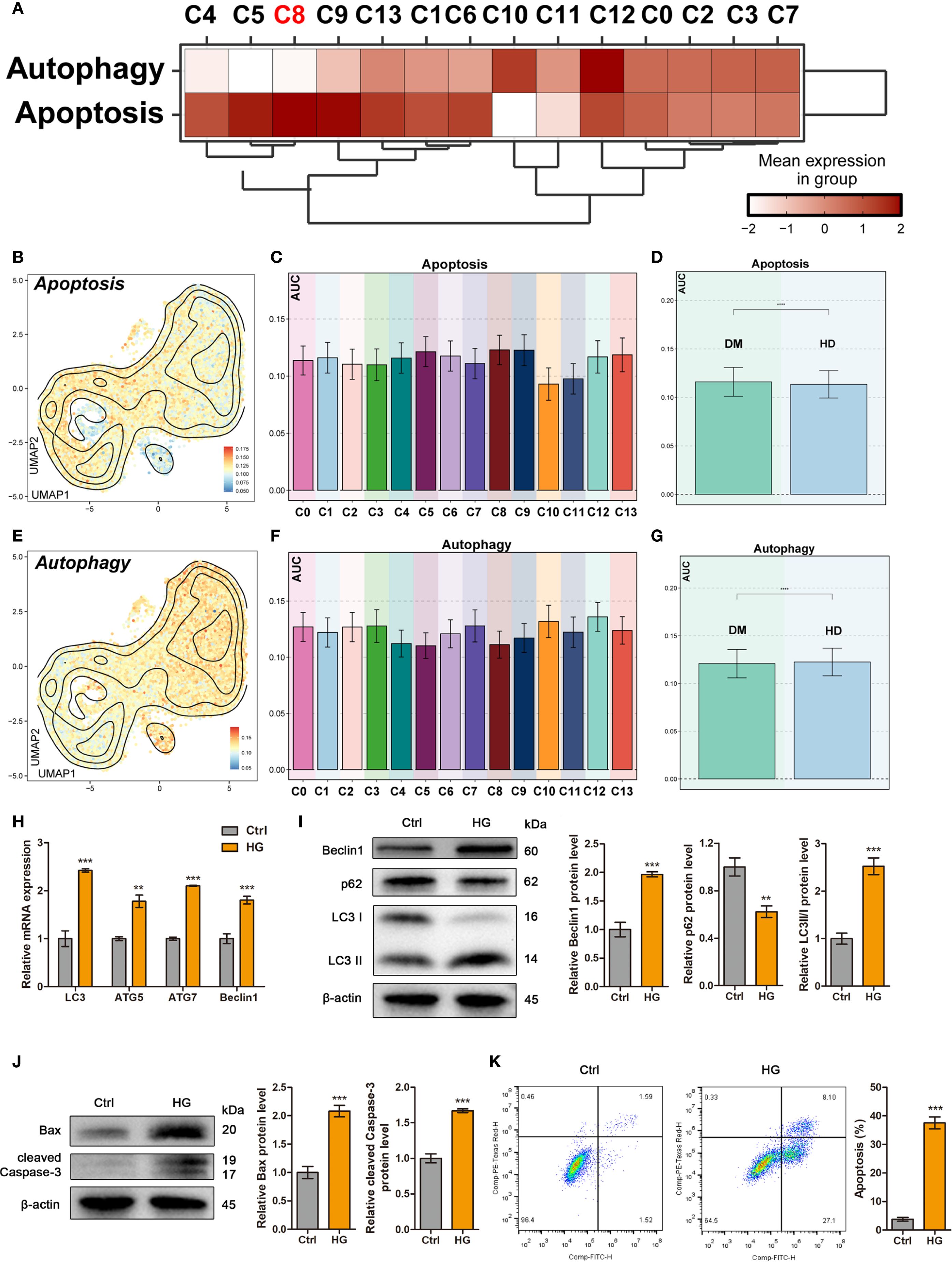 A composite figure displays various analyses related to autophagy and apoptosis. Panel A shows a heatmap of mean expression grouped by type, with colors indicating expression levels. Panels B and E present UMAP plots for apoptosis and autophagy, respectively. Panels C and F display bar graphs comparing AUC values for different clusters. Panels D and G show bar graphs depicting the AUC for apoptosis and autophagy in two conditions: DM and HD. Panel H illustrates relative mRNA expression levels with a bar graph. Panels I and J contain Western blot analyses with corresponding bar graphs, focusing on protein levels in control (Ctrl) and high glucose (HG) conditions. Panel K presents flow cytometry plots and an apoptosis percentage comparison bar graph.