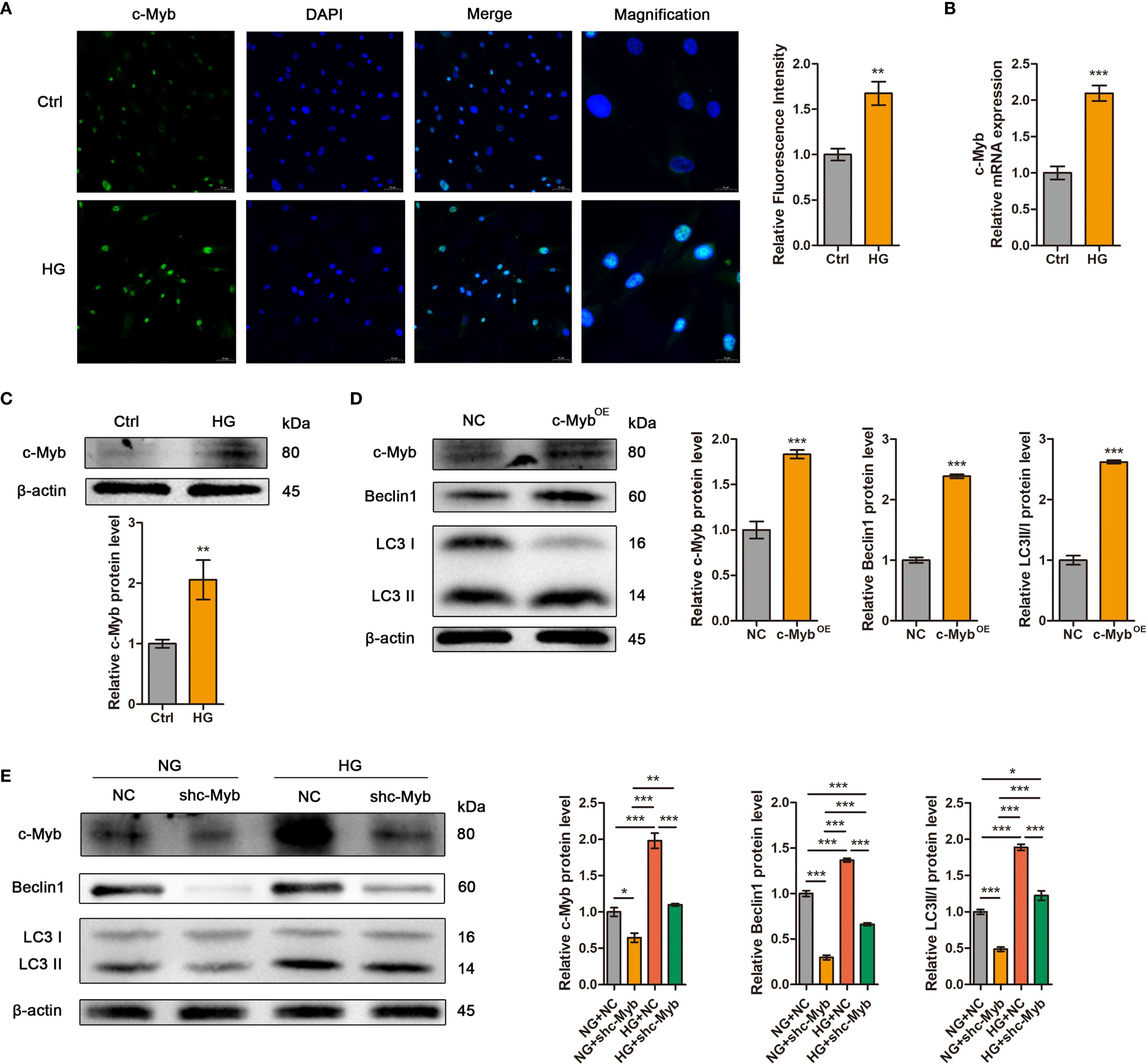 Figure 5. High glucose enhanced autophagy in ADSCs via c-Myb upregulation. (A) The expression of c-Myb was determined by immunofluorescence assay. Quantitative analysis was performed by measuring the mean fluorescence intensity of c-Myb. The nuclei were stained blue using DAPI. Scale bar = 50 mm. Magnification, Scale bar = 20 mm. (B) RT-qPCR analysis of c-Myb mRNA in ADSCs treated with or without high glucose. (C) Western blot analysis of c-Myb protein in ADSCs treated with or without high glucose. β-actin was used as an internal control. (D) Western blot analysis of c-Myb and autophagy-related proteins in ADSCs infected with c-Myb plasmid and vector control. β-actin was used as an internal control. OE, Overexpression. (E) Western blot analysis of c-Myb and autophagy-related proteins in ADSCs infected with c-Myb shRNA or vector control in normal glucose (NG) or high glucose (HG). β-actin was used as an internal control. Data are presented as mean ± SD from three independent biological replicates (n = 3). (*p < 0.05, **p < 0.01, ***p < 0.001).