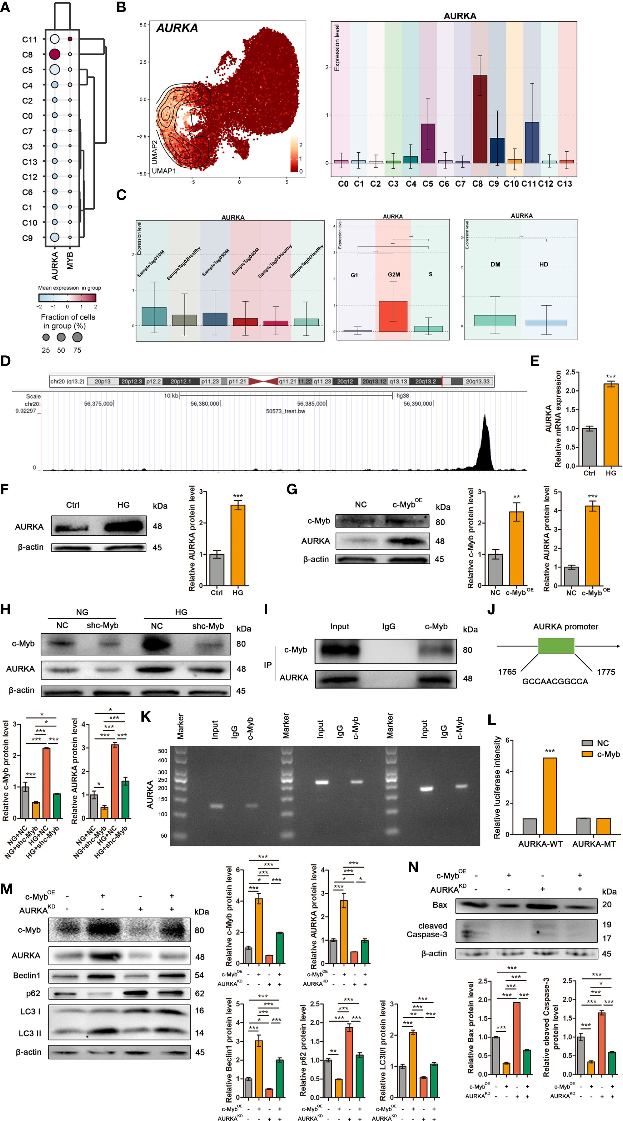 Figure 6. c-Myb transcriptionally activates AURKA to mediate autophagy in ADSCs. (A) The bubble plot showed the mean expression levels of AURKA and MYB across the 14 DM ADSCS subpopulations. (B) UMAP and bar plots revealed the distribution and expression levels of AURKA across 14 subpopulations. (C) Bar plots presented AURKA expression across different patient samples, cell cycle phases, and groups. (D) One genomic region in AURKA that exhibited increased c-Myb ChIP–seq signal in chromatin. (E) RT–qPCR analysis of AURKA mRNA in ADSCs treated with or without high glucose. (F) Western blot analysis of AURKA protein in ADSCs treated with or without high glucose. β-actin was used as an internal control. (G) Western blot analysis of c-Myb and AURKA proteins in ADSCs infected with c-Myb plasmid and vector control. β-actin was used as an internal control. OE, Overexpression. (H) Western blot analysis of c-Myb and AURKA proteins in ADSCs infected with c-Myb shRNA or vector control under normal glucose (NG) or high glucose (HG). β-actin was used as an internal control. (I) Co-IP assay to detect the interaction between c-Myb and AURKA. (J) The predicted binding site of c-Myb in the AURKA promoter region from the JASPAR database (relative profile score threshold 90%). (K) ChIP assay to analyze promoter co-occupancy by c-Myb and AURKA. (L) Luciferase reporter assay of c-Myb promoter activity with WT or mutated AURKA binding element (FHRE) in ADSCs. WT, Wild Type; MT, Mutant Type. (M) Western blot analysis of c-Myb, AURKA, and autophagy-related proteins in ADSCs infected with c-Myb plasmid, AURKA shRNA, or vector control. OE, Overexpression; KD, Knockdown. (N) Western blot analysis of apoptosis-related proteins in ADSCs infected with c-Myb plasmid, AURKA shRNA, or vector control. OE, Overexpression; KD, Knockdown. Data are presented as mean ± SD from three independent biological replicates (n = 3). (*p < 0.05, **p < 0.01, ***p < 0.001).