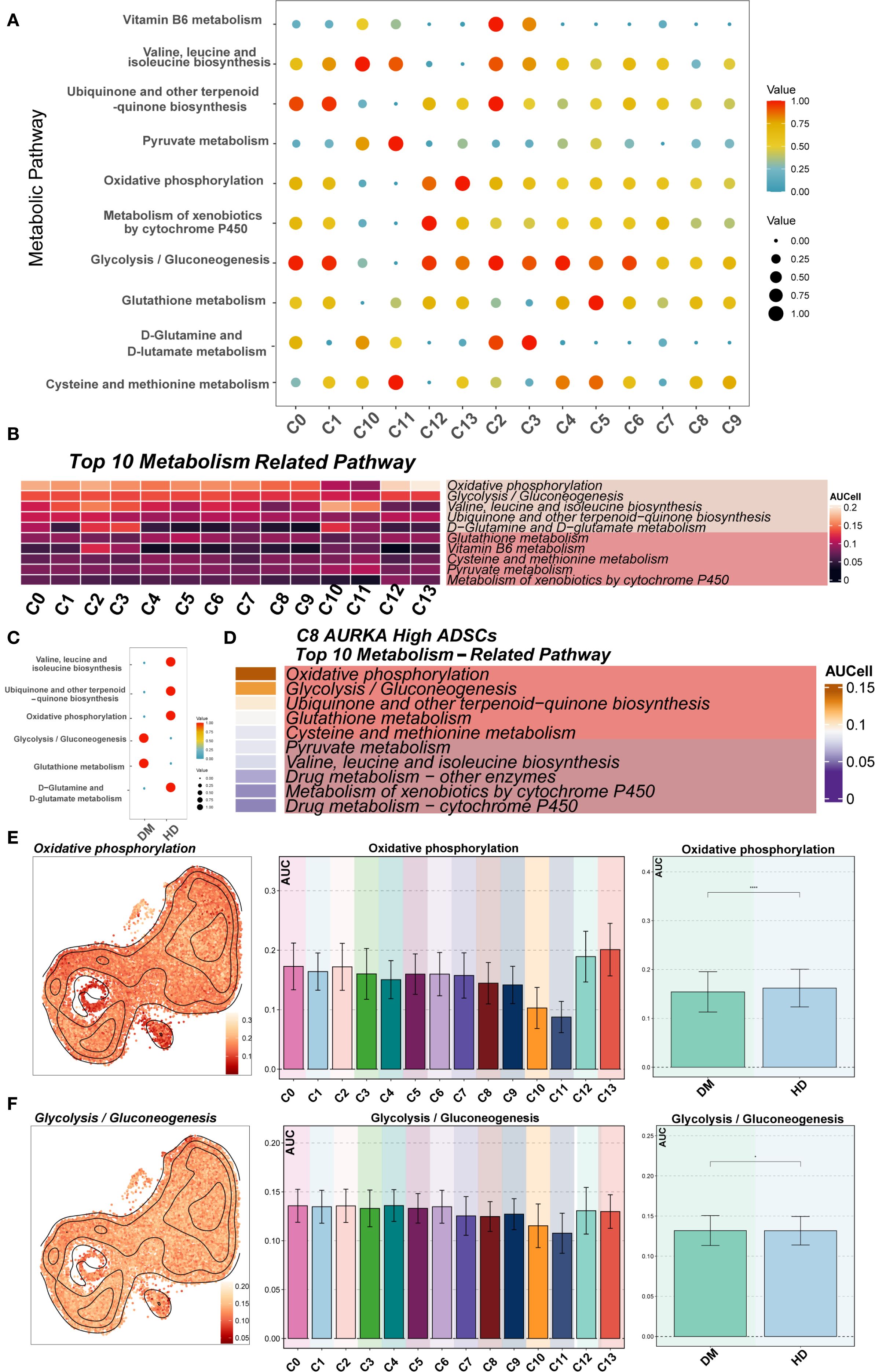 Figure 7. Metabolic pathway analysis of DM ADSCs subpopulations. (A, B) The bubble plot and heatmap showed the top 10 enriched metabolism-related pathway scores across the 14 DM ADSCs subpopulations. (C) The bubble plot illustrated the scores of metabolism-related pathways across different groups. (D) The heatmap displayed the top 10 enriched metabolic pathways in the C8 AURKA ADSCs subpopulation. (E) UMAP plots and bar graphs depicted the distribution and differential activity of the Oxidative phosphorylation pathway across DM ADSCs subpopulations and groups. (F) UMAP plots and bar graphs showed the distribution and differential activity of the Glycolysis/Gluconeogenesis pathway across DM ADSCs subpopulations and groups. (*p < 0.05, ***p < 0.001, ****p < 0.0001).