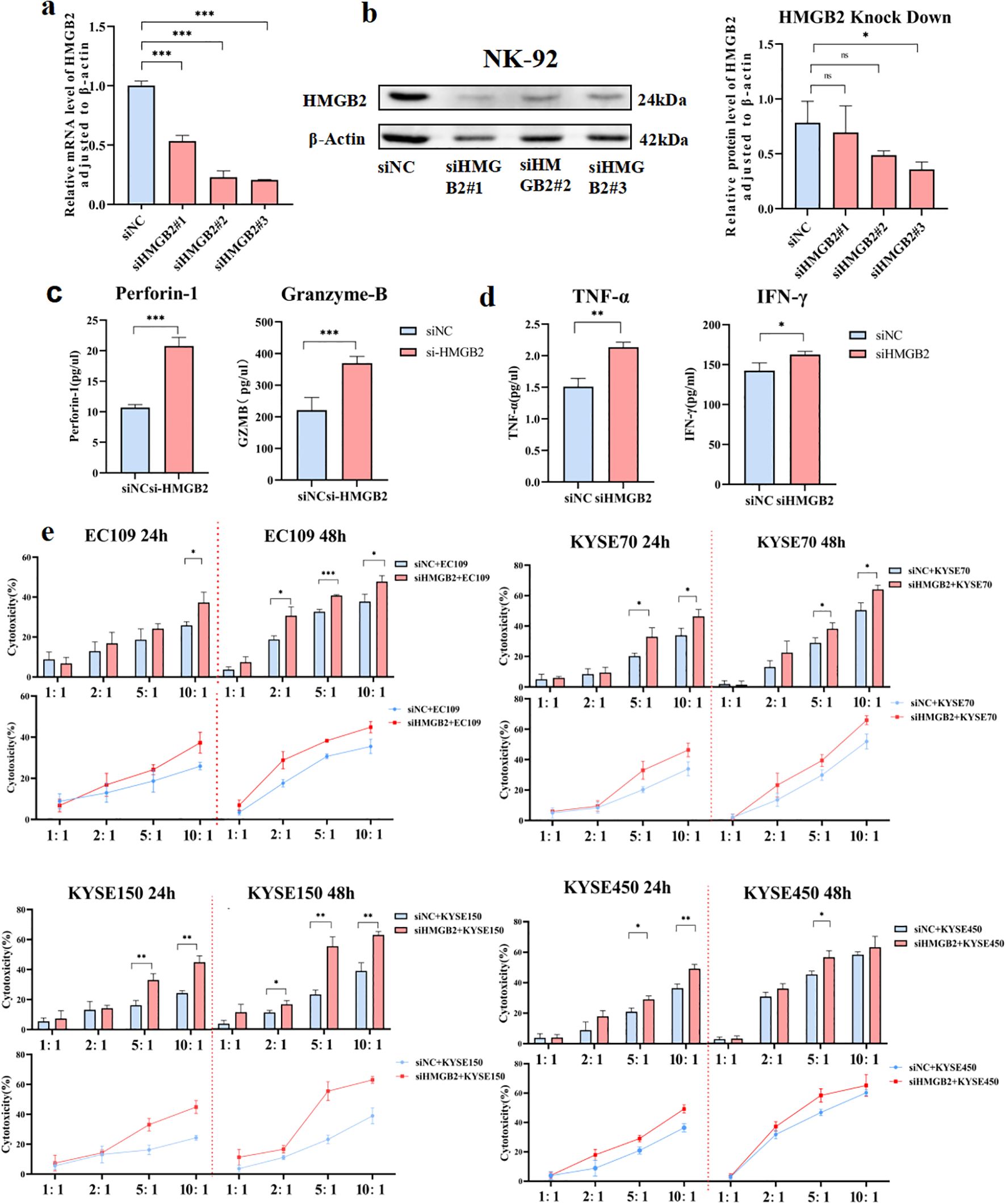Figure 4. Down-regulation of HMGB2 enhances the function of NK cells. (a) qRT-PCR analysis of HMGB2 mRNA levels in NK-92 cells transfected with siNC, siHMGB2 #1, siHMGB2 #2, and siHMGB2 #3. (b) Western blot analysis of HMGB2 protein levels in NK-92 cells transfected with siNC or siHMGB2. (c) The secretion levels of perforin-1 and granzyme B were measured by ELISA in NK-92 cells after HMGB2 knockdown. (d)Cytokine release (TNF-α and IFN-γ) from NK-92 cells with HMGB2 knock down were showed in histogram. (e) Cytotoxicity of NK-92 cells with HMGB2 knockdown against various ESCC cell lines (EC109, KYSE70, KYSE150, KYSE450) was assessed at 24h and 48h using a cytotoxicity assay. Statistical significance was determined using one-way ANOVA with Tukey’s post hoc test for normally distributed data, or Kruskal–Wallis tests followed by Dunn’s post hoc tests for non-normally distributed data. *p < 0.05, **p < 0.01, ***p < 0.001. Error bars represent the mean ± SD.
