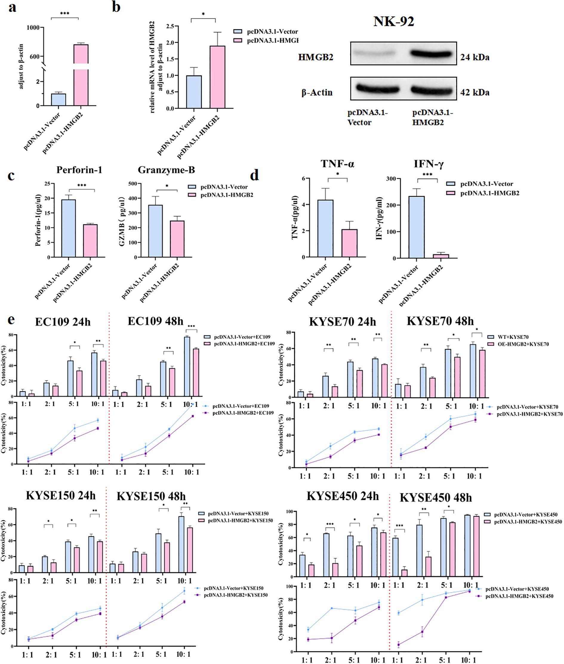 Figure 5. Overexpression of HMGB2 inhibits the function of NK-92 cells. (a) qRT-PCR analysis of HMGB2 mRNA levels in NK-92 cells transfected with pcDNA3.1-Vector or pcDNA3.1-HMGB2. (b) Western blot analysis of HMGB2 protein expression in NK-92 cells transfected with pcDNA3.1-Vector or pcDNA3.1-HMGB2. (c) The secretion levels of perforin-1 and granzyme B were measured by ELISA in NK-92 cells after HMGB2 overexpression. (d) Cytokine release (TNF-α and IFN-γ) from NK-92 cells with HMGB2 overexpression was showed in histogram. (e) Cytotoxicity of NK-92 cells with HMGB2 overexpression against various ESCC cell lines (EC109, KYSE70, KYSE150, KYSE450) at 24h and 48h was assessed using a cytotoxicity assay. Statistical significance was determined using one-way ANOVA with Tukey’s post hoc test for normally distributed data, or Kruskal–Wallis tests followed by Dunn’s post hoc tests for non-normally distributed data. *p < 0.05, **p < 0.01, ***p < 0.001. Error bars represent the mean ± SD.