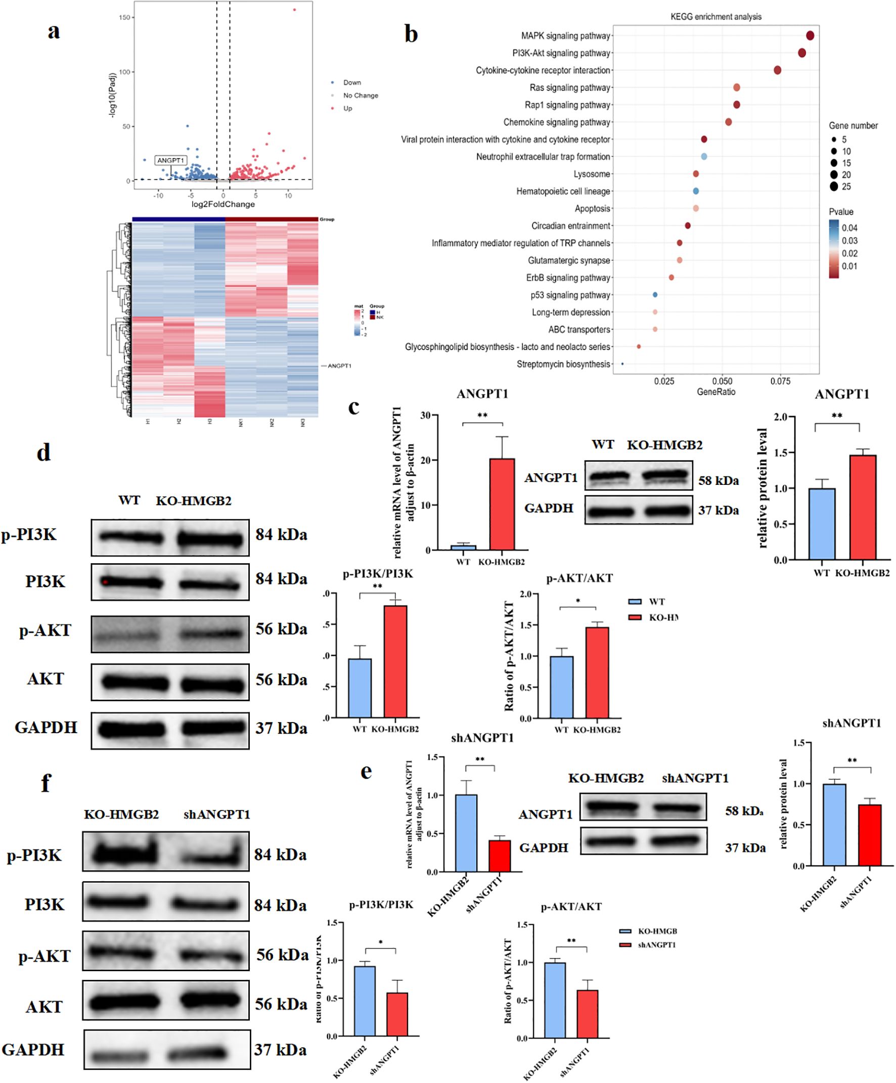 Figure 7. Knockout of HMGB2 enhances PI3K-AKT phosphorylation levels in NK-92 cells by upregulating ANGPT1. (a) Differential gene expression analysis between KO-HMGB2 NK cells and wild-type (WT) NK cells. The volcano plot (upper panel) highlights significant changes in gene, while the expressionheatmap (lower panel) displays the expression levels of differentially expressed genes. (b) KEGG pathway enrichment analysis of differentially expressed genes in KO-HMGB2 NK cells. (c) qRT-PCR and Western blot analysis of ANGPT1 expression in KO-HMGB2 NK cells compared to WT NK cells. (d) Western blot analysis of PI3K/AKT signaling in KO-HMGB2 NK cells, The histogram (right panel) shows the quantitative analysis of protein expression. (e) qRT-PCR and Western Blot analysis was performed to evaluate ANGPT1 mRNA expression in KO-HMGB2 NK cells following ANGPT1 knockdown. (f) Western blot analysis of PI3K/AKT signaling after ANGPT1 knockdown in KO-HMGB2 NK cells, The histogram (right panel) shows the quantification of protein expression. Data are expressed as means ± SD from three independent experiments. Statistical significance was determined by unpaired t-test or one-way ANOVA; *P < 0.05, **P < 0.01.