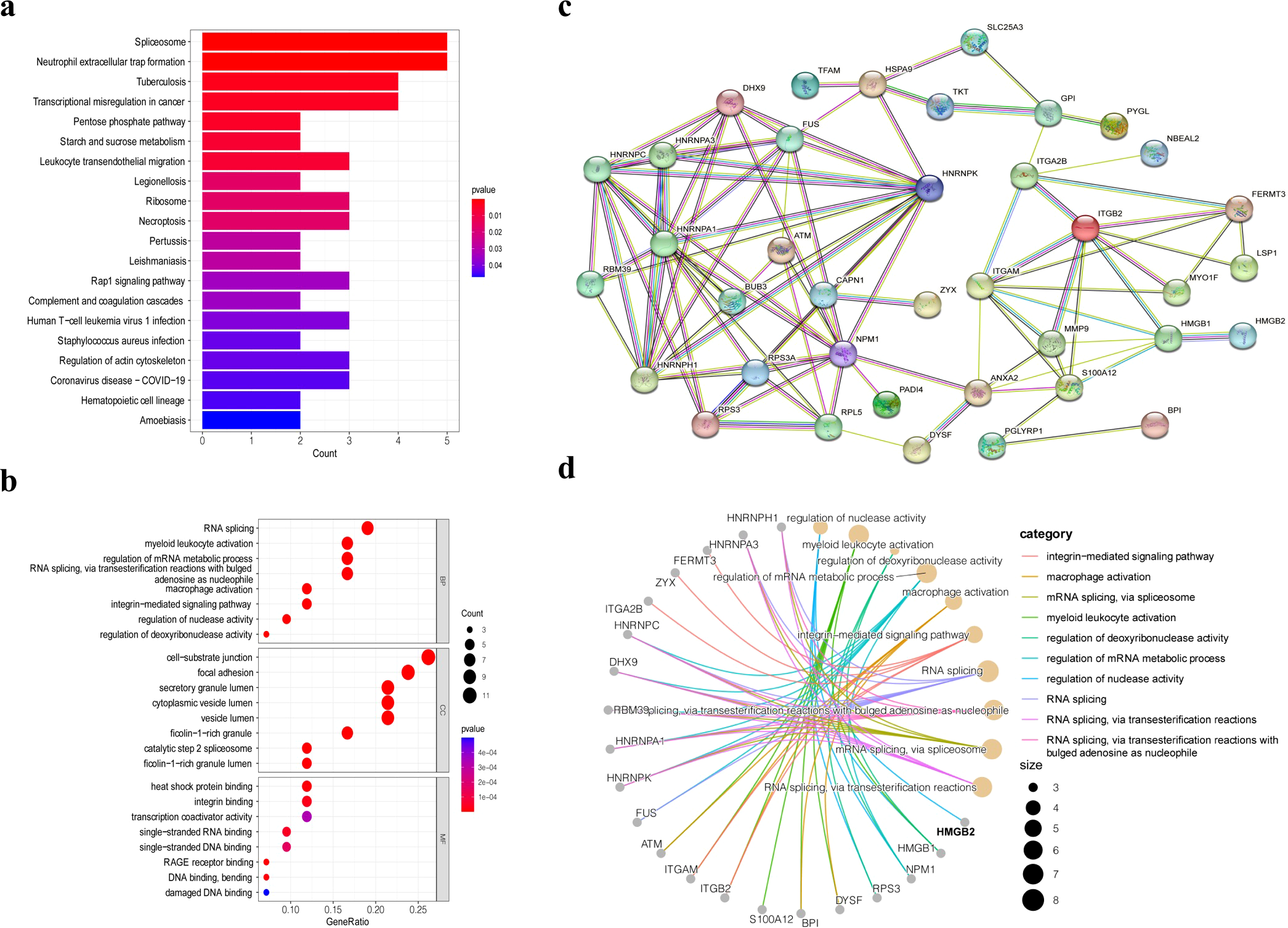 KEGG and GO enrichment analyses of the 42 genes are shown in Figure 2. KEGG pathway analysis revealed that these genes were primarily enriched in spliceosome, neutrophil extracellular trap formation, tuberculosis, and transcriptional misregulation in cancer (Figure 2a). GO analysis revealed that in the Biological Process (BP) category, enriched terms included RNA splicing, myeloid leukocyte activation, and regulation of mRNA metabolic processes. In the Cellular Component (CC) category, the enriched terms were cell-substrate junction, focal adhesion, and secretory granule lumen, while the Molecular Function (MF) category included heat shock protein binding, integrin binding, and transcription coactivator activity (Figure 2b).