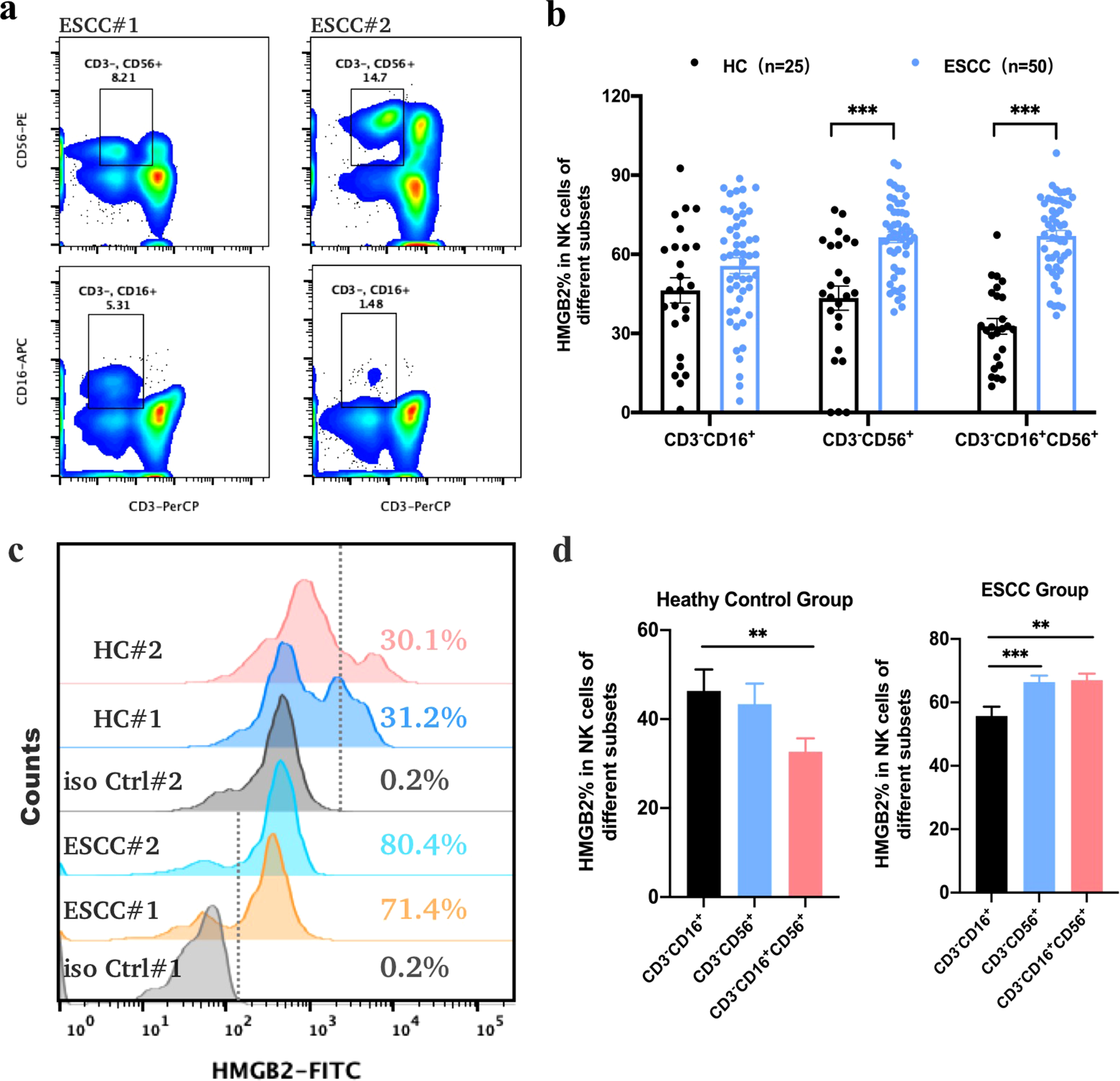 Expression of HMGB2 protein in NK cells as determined by flow cytometry. (a) Representative dot plots showing the gating strategy for CD3-CD56+ and CD3-CD16+ NK cell populations from the peripheral blood of ESCC patients. (b) The positive expression rates of HMGB2 in different NK cell subsets (CD3-CD16+, CD3-CD56+, and CD3-CD16+CD56+) from healthy controls (HC, n = 25) and ESCC patients (n = 50). (c) Overlaid histograms illustrating HMGB2 expression in NK cells from representative ESCC patients and healthy controls, with fluorescence distributions of isotype controls shown for comparison. (d) Bar plots summarizing HMGB2 expression among different NK cell subsets in the HC and ESCC groups. Statistical significance was determined using one-way ANOVA with Tukey’s post hoc test for normally distributed data, or Kruskal–Wallis tests followed by Dunn’s post hoc tests for non-normally distributed data. *p < 0.05, **p < 0.01, ***p < 0.001. Error bars represent the mean ± SD.