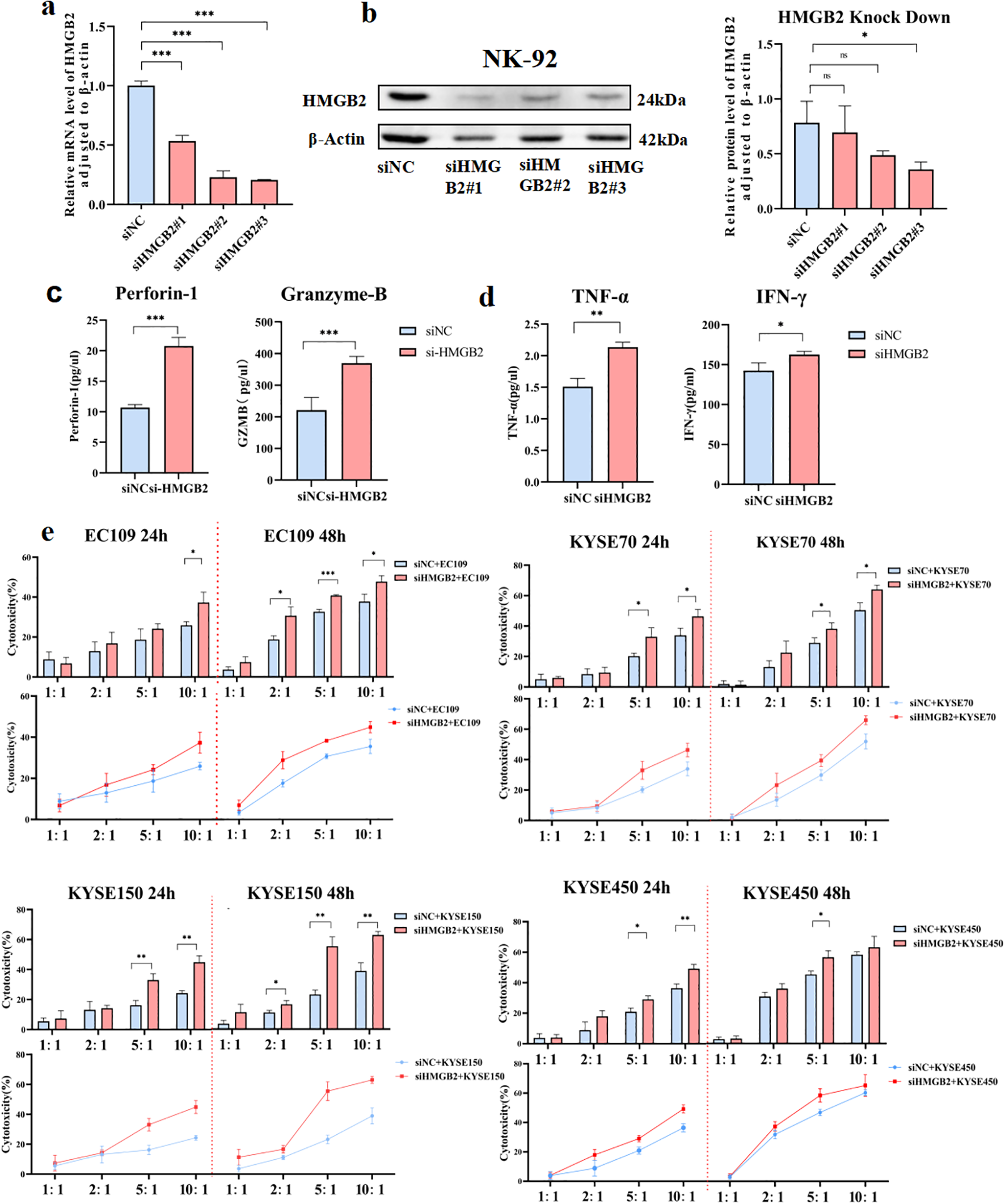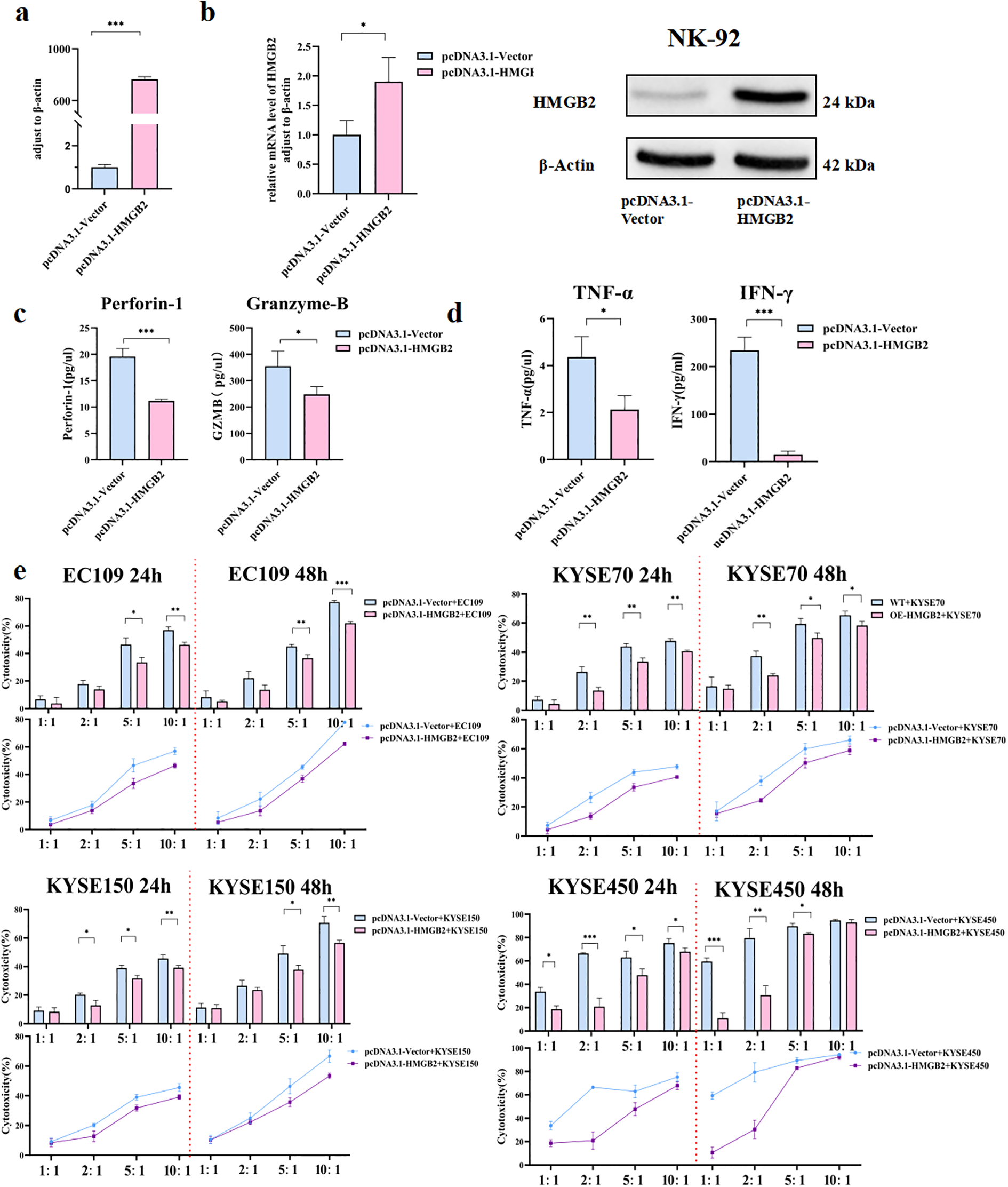 To assess the impact of HMGB2 overexpression on NK cell function, NK-92 cells were transfected with the pcDNA3.1-HMGB2 plasmid to induce HMGB2 expression (Figure 5). Successful overexpression was confirmed by both qRT-PCR and Western blot analyses, which demonstrated significantly increased mRNA and protein levels of HMGB2 (Figures 5a, b). Following the overexpression of HMGB2, we observed a marked reduction in the expression of key cytotoxic molecules, including perforin and granzyme B, as measured by Elisa (Figure 5c). Moreover, flow cytometry analysis revealed a significant decrease in the secretion of pro-inflammatory cytokines, specifically IFN-γ and TNF-α, indicating a suppression of NK cell activation (Figure 5d). Additionally, cytotoxicity assays against ESCC cell lines demonstrated that HMGB2 overexpression significantly impaired NK cell-mediated tumor cell killing, with reduced tumor cell lysis observed at multiple effector-to-target ratios (Figure 5e). These findings collectively suggest that HMGB2 acts as a negative regulator of NK cell function, and its elevated expression limits the cytotoxic activity and immune response of NK cells.