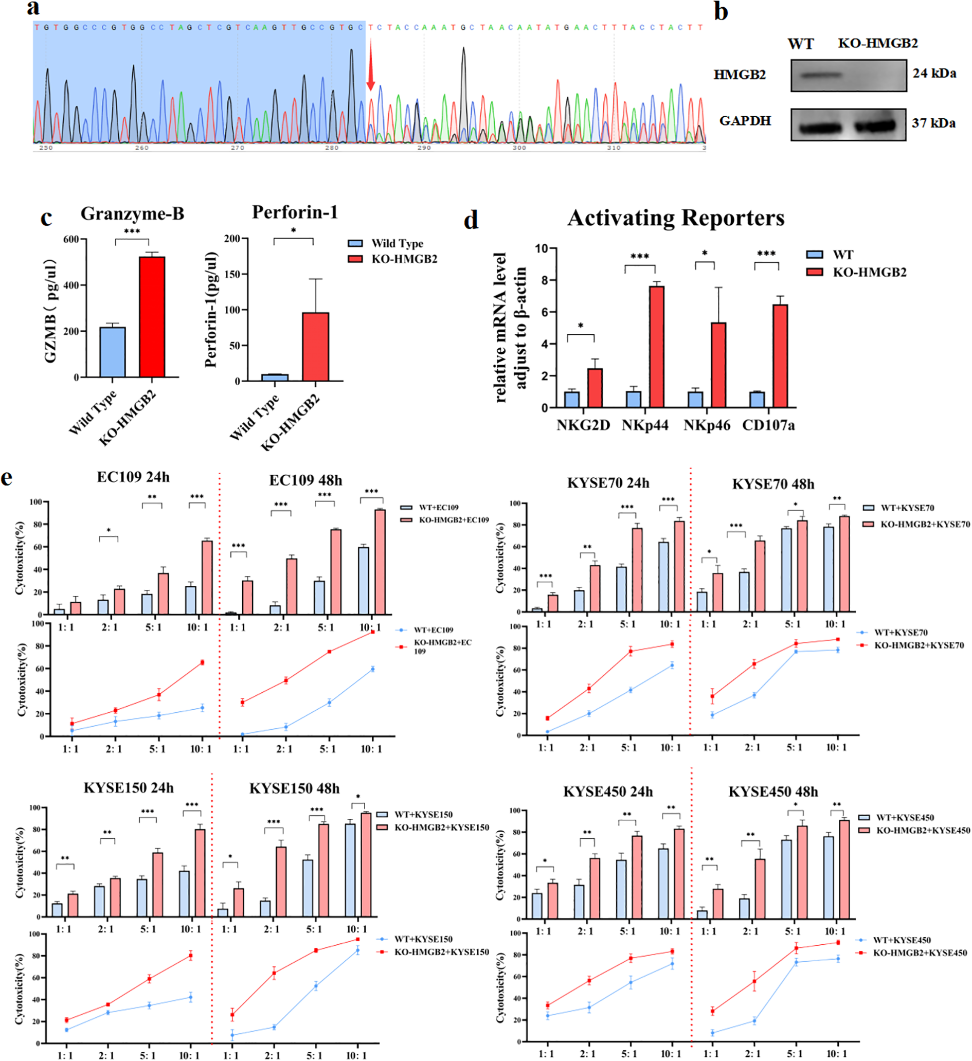 Confirmation of HMGB2 knockout and functional assessment of KO-HMGB2 NK-92 cells. (a) Sanger sequencing chromatograms showing two distinct allelic edits in the KO-HMGB2 NK-92 cells. (b) Western blot analysis of HMGB2 protein levels in wild-type (WT) and KO-HMGB2 NK-92 cells. (c) ELISA analysis of perforin-1 and granzyme B secretion in supernatants collected from KO-HMGB2 and WT NK-92 cells co-cultured with KYSE450 cells for 12 hours. (d) qRT-PCR analysis of activating receptors (NKG2D, NKp44, NKp46, and CD107a) in KO-HMGB2 and WT NK-92 cells. (e) Cytotoxicity of NK-92 cells with HMGB2 knock out against various ESCC cell lines (EC109, KYSE70, KYSE150, KYSE450) at 24h and 48h was assessed using a cytotoxicity assay. Statistical significance was determined using one-way ANOVA with Tukey’s post hoc test for normally distributed data, or Kruskal–Wallis tests followed by Dunn’s post hoc tests for non-normally distributed data. *p < 0.05, **p < 0.01, ***p < 0.001. Error bars represent the mean ± SD.