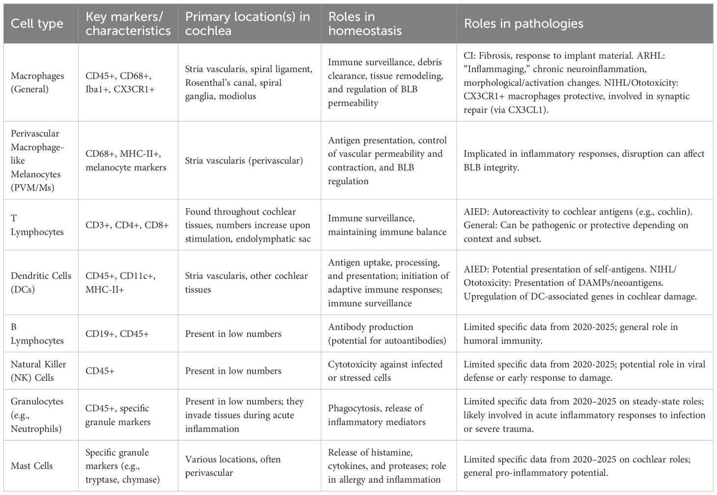 Rather than being an immunologically inert environment, the cochlea harbors a range of resident immune populations that are vital to homeostasis maintenance, damage response, and immune surveillance (5). A scoping review published in 2024 systematically collected data on these cells, confirming the presence of macrophages, lymphocytes, leukocytes, and mast cells in various inner ear structures of different mammalian species under steady-state conditions (Table 1). This underscores the need for further research on their specific roles (5).