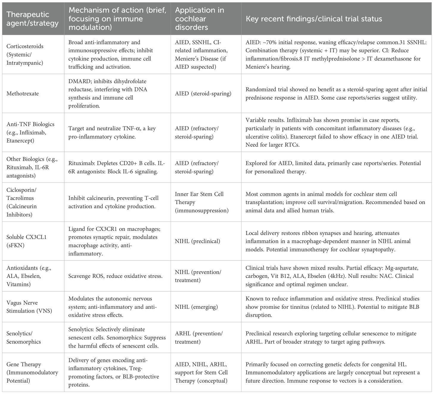 Over the past five years, cochlear immunology has experienced a paradigm shift, challenging the long-held perception of the inner ear as an “immune-privileged” site. Our review consolidates recent advancements that elucidate the cochlea’s intricate local immune system, comprising resident macrophages, Tlymphocytes, and dendritic cells, in conjunction with the regulatory blood-labyrinth barrier. We investigate how immune dysregulation contributes to various auditory disorders, including autoimmune inner ear disease, inflammatory responses to cochlear implantation, noise-induced hearing loss, and age-related hearing loss. The review critically assesses therapeutic strategies, encompassing both traditional immunosuppressants and innovative immunomodulatory approaches, as well as interventions targeting fundamental aging pathways. Significant research gaps are highlighted, including the need for reliable biomarkers, a deeper understanding of immune cell heterogeneity, and the development of enhanced drug delivery systems. These advancements present promising opportunities for the development of targeted treatments for immune-mediated hearing loss, with the potential to revolutionize the clinical management of these conditions.