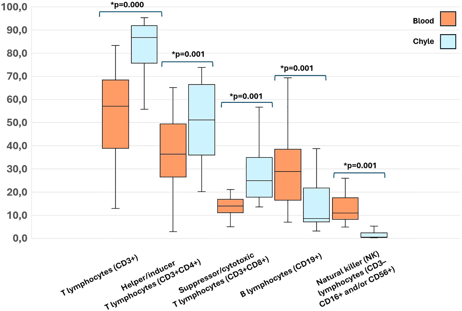 Comparison of peripheral blood and chyle immunological profile